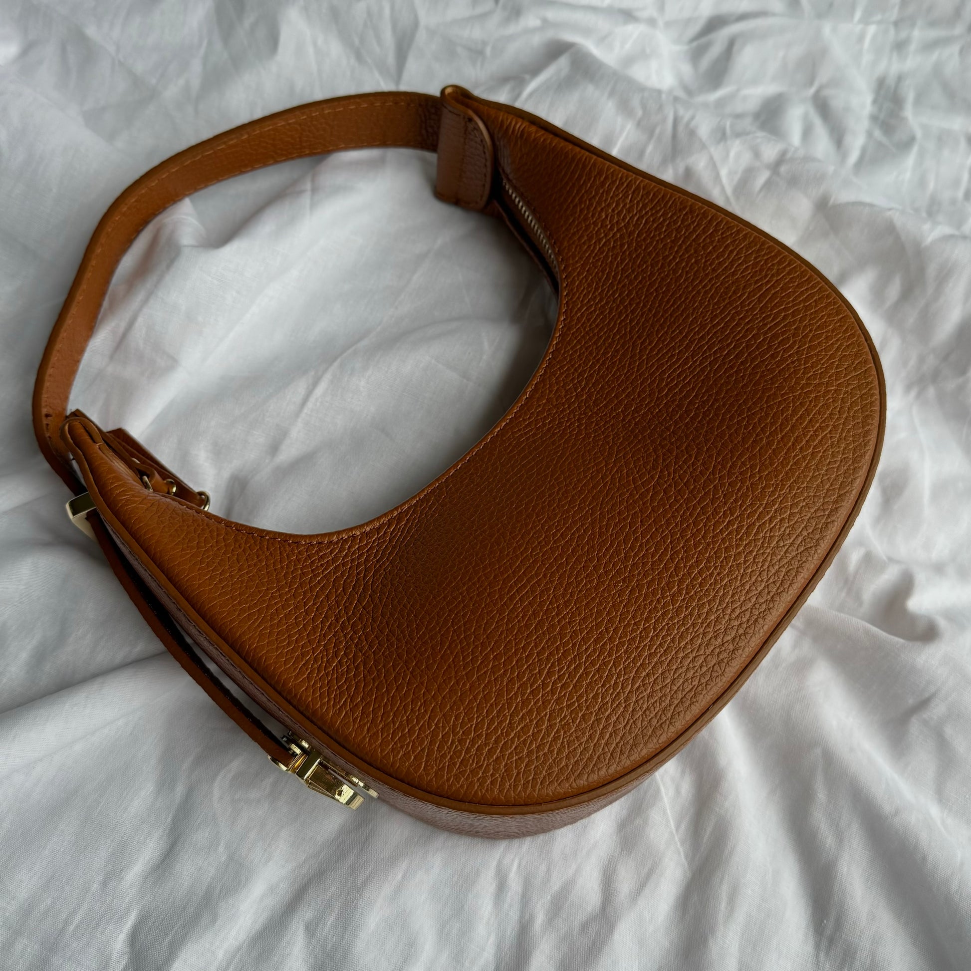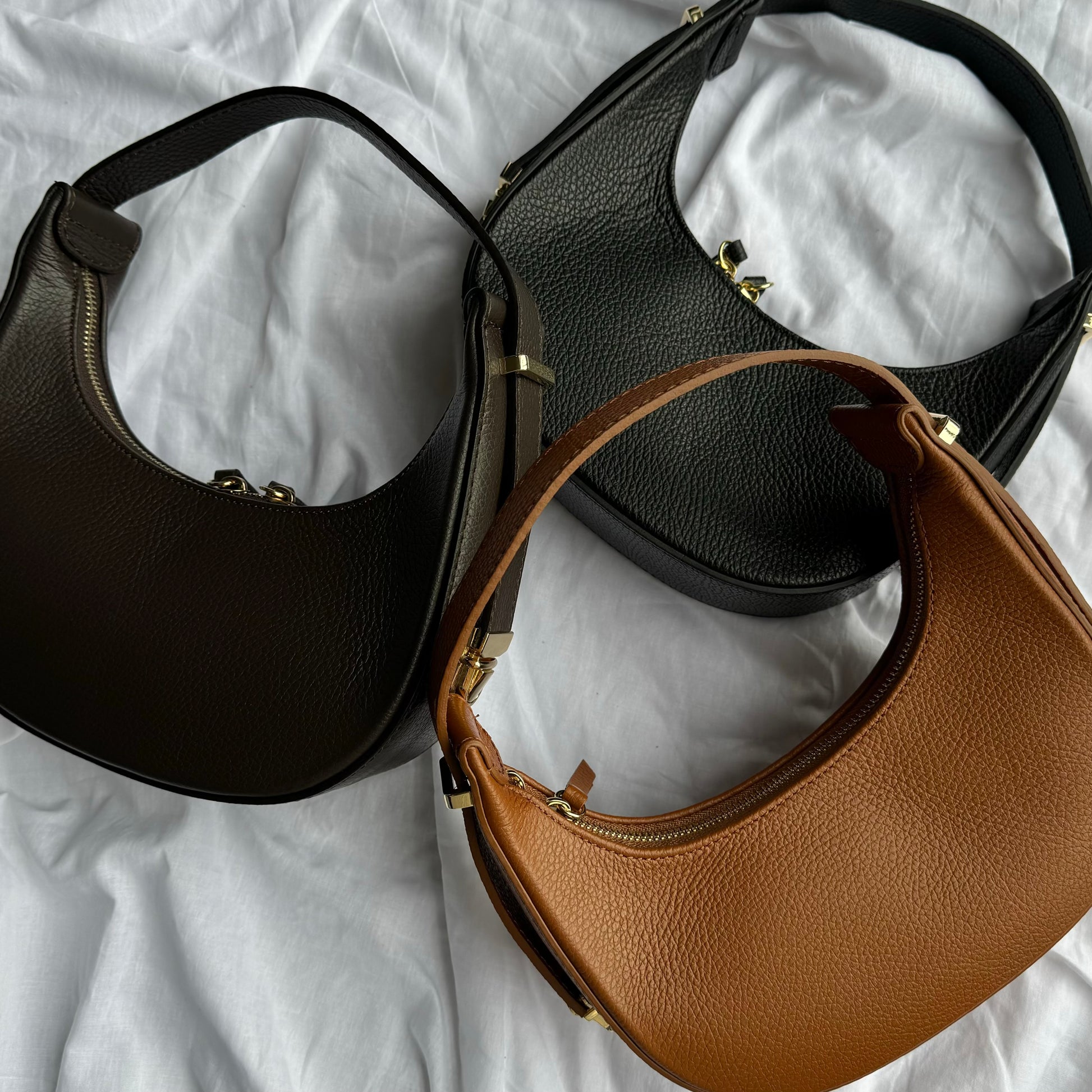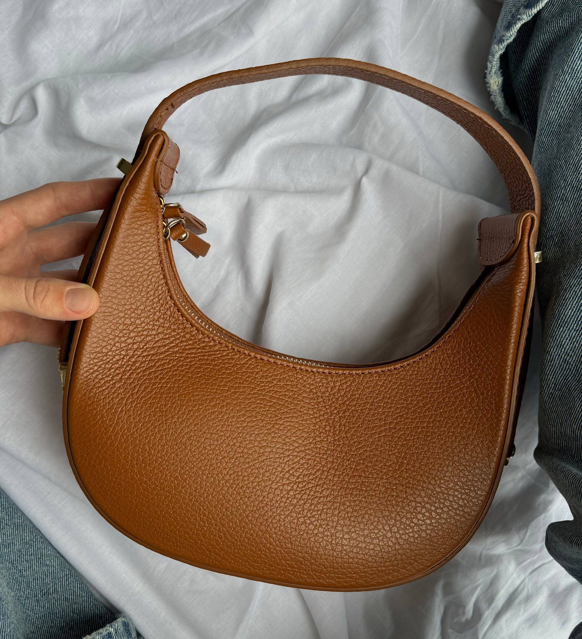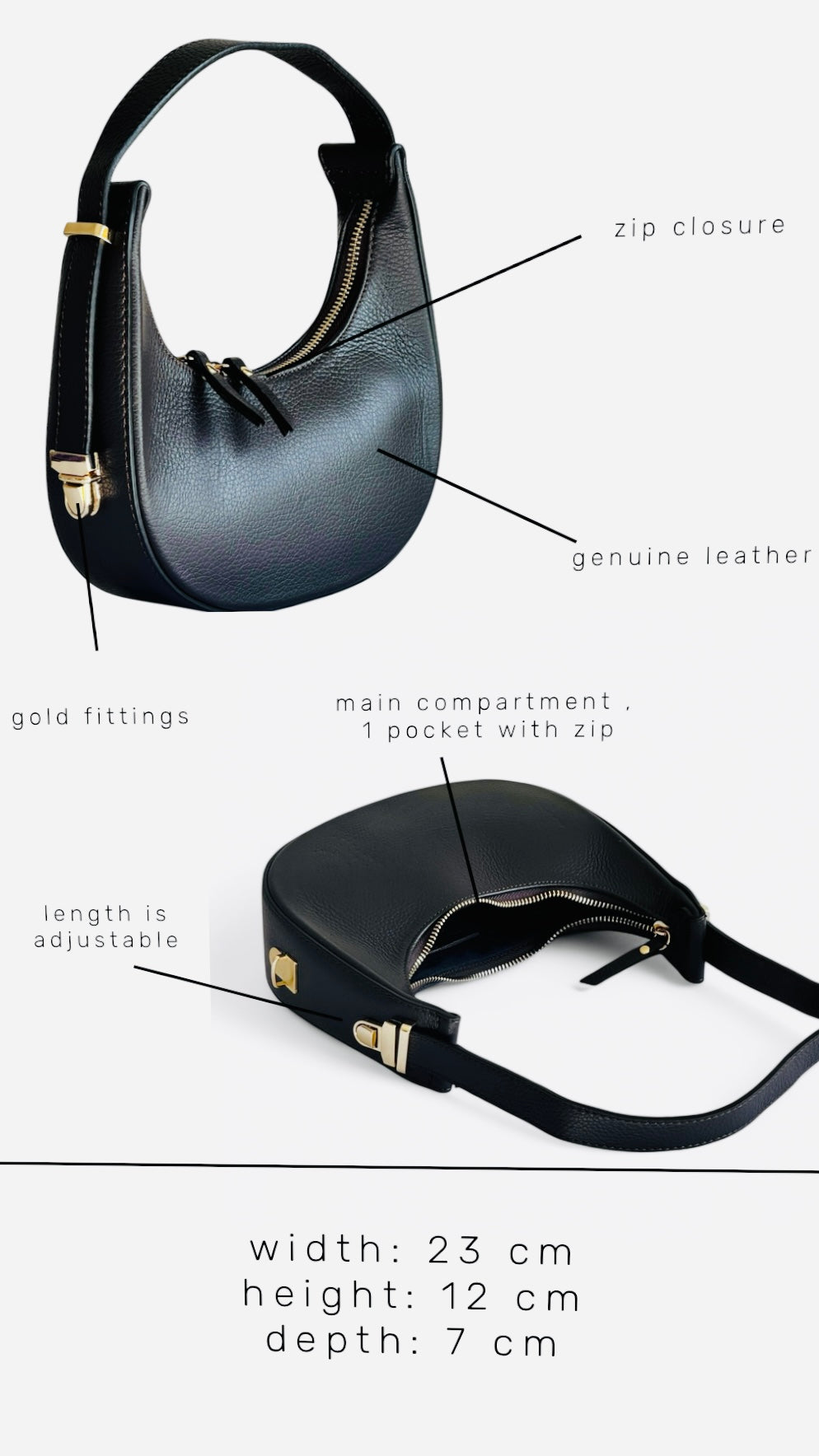 Elegancka, kompaktowa torebka wykonana z wysokiej jakości włoskiej skóry naturalnej o delikatnej fakturze. Klasyczny, półokrągły kształt i ponadczasowy kolor sprawiają, że pasuje zarówno do codziennych stylizacji, jak i na wieczorne wyjścia.