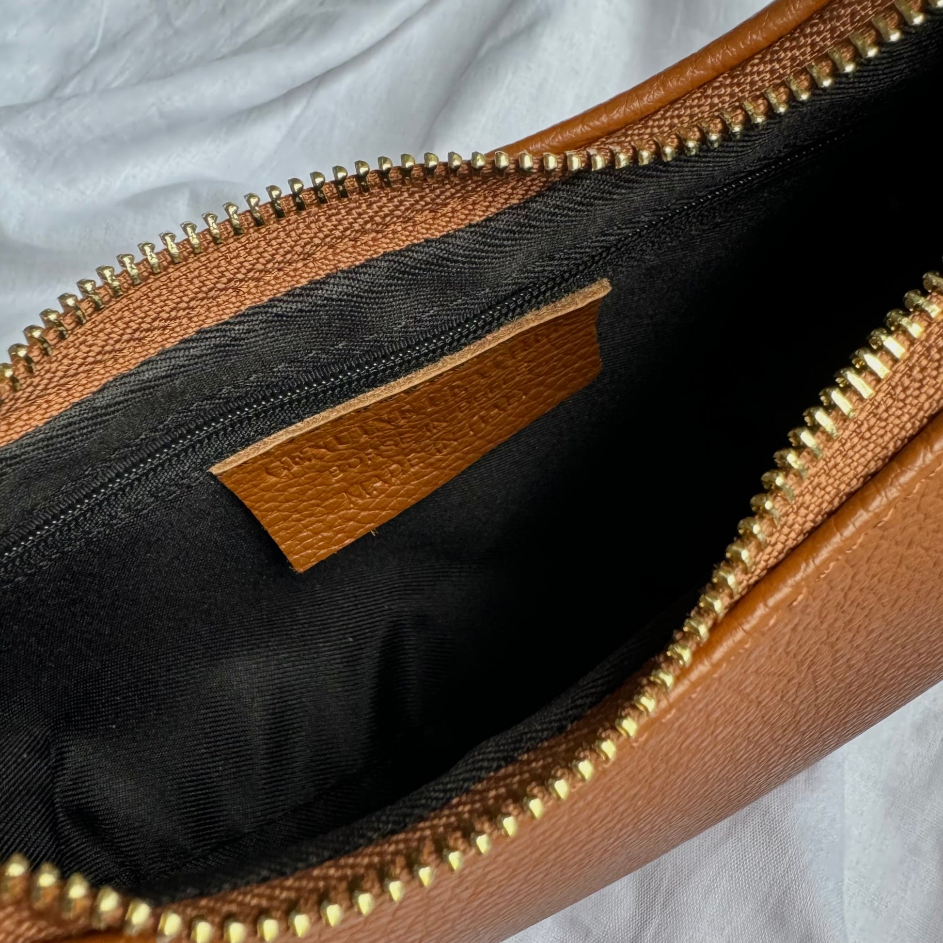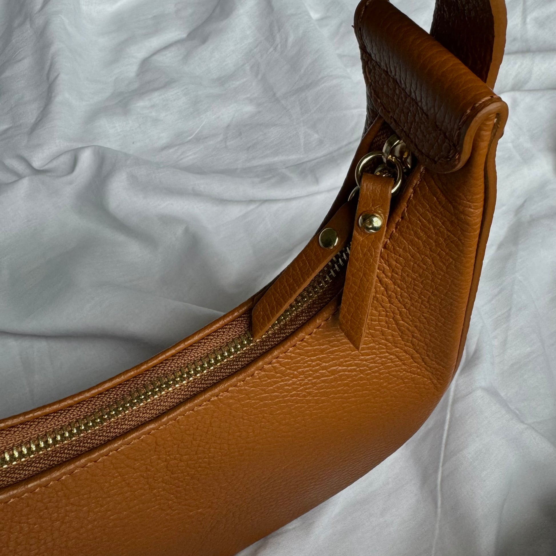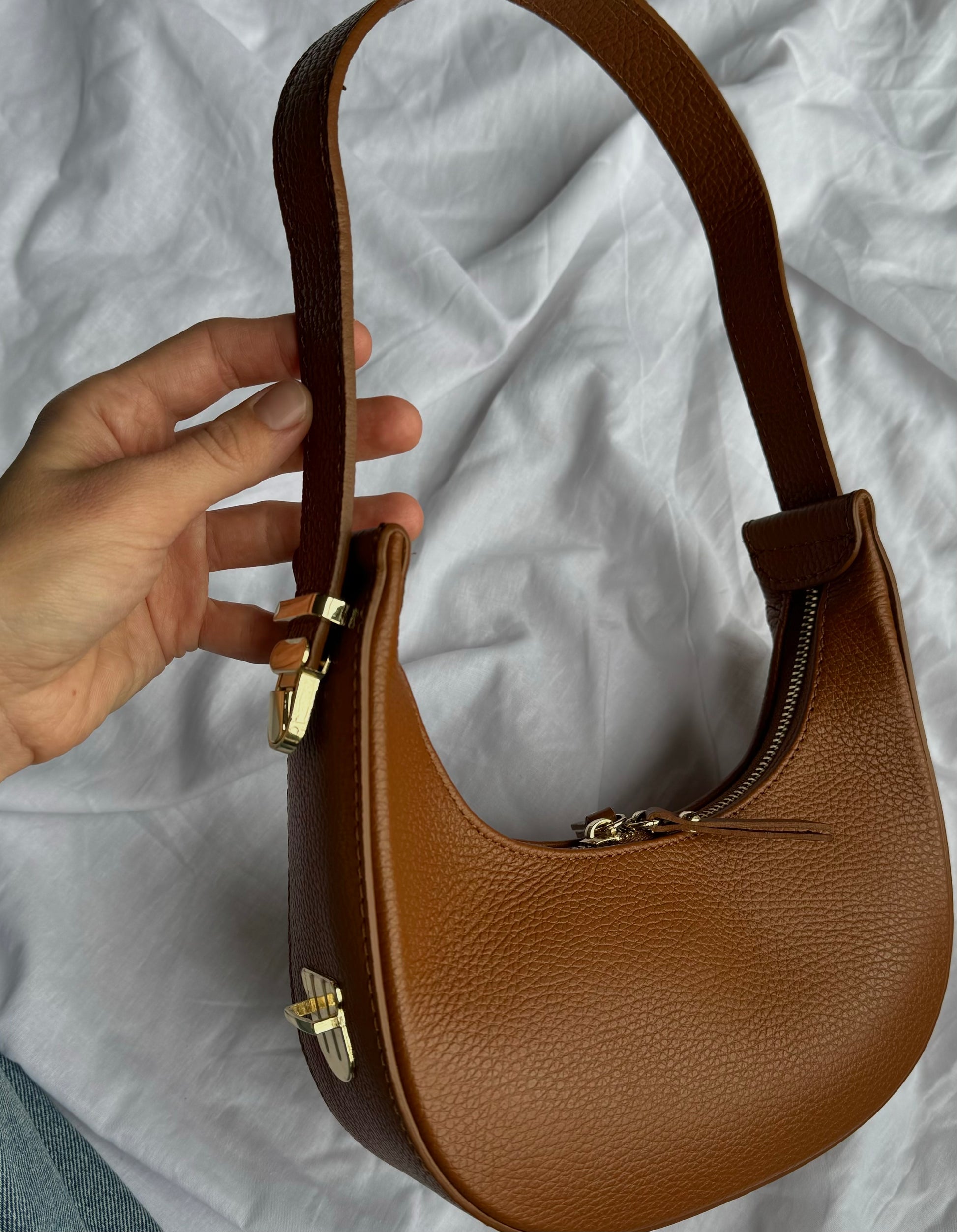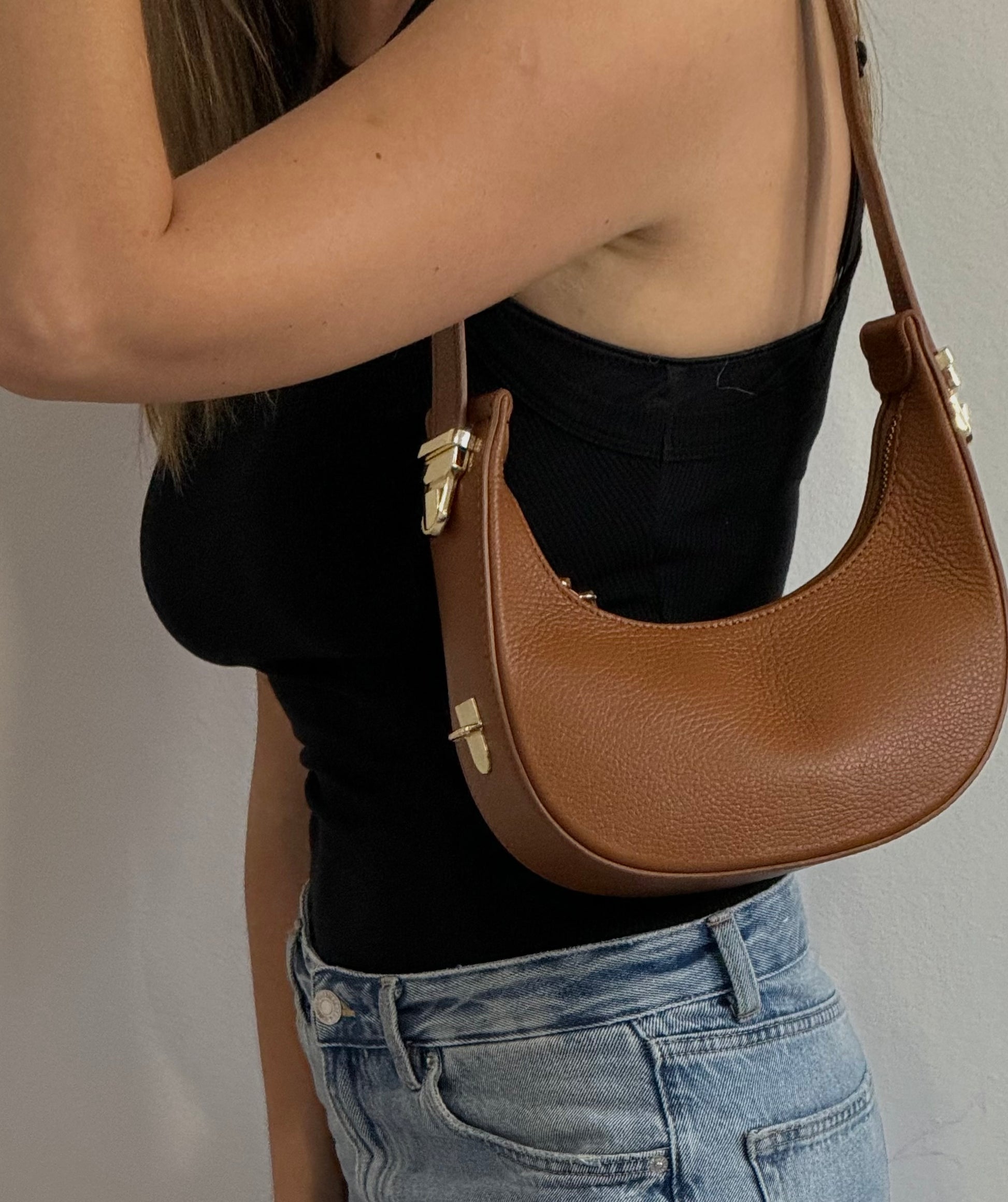 Elegancka, kompaktowa torebka wykonana z wysokiej jakości włoskiej skóry naturalnej o delikatnej fakturze. Klasyczny, półokrągły kształt i ponadczasowy kolor sprawiają, że pasuje zarówno do codziennych stylizacji, jak i na wieczorne wyjścia.