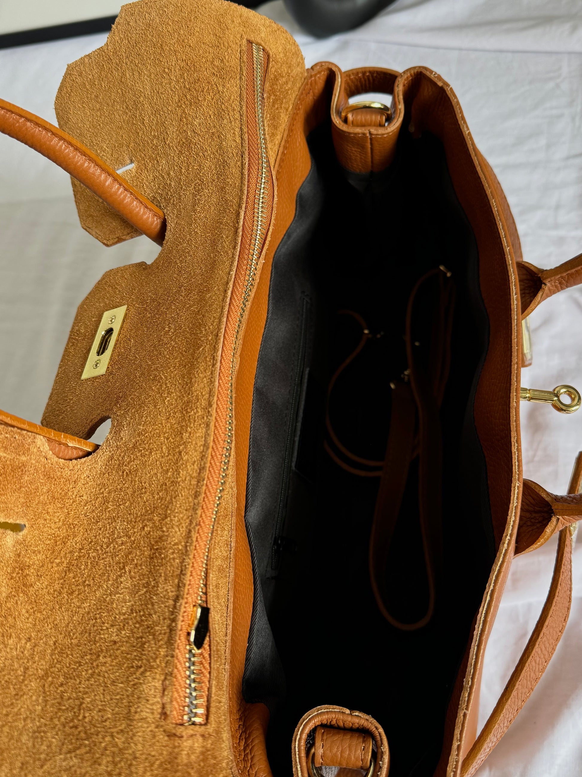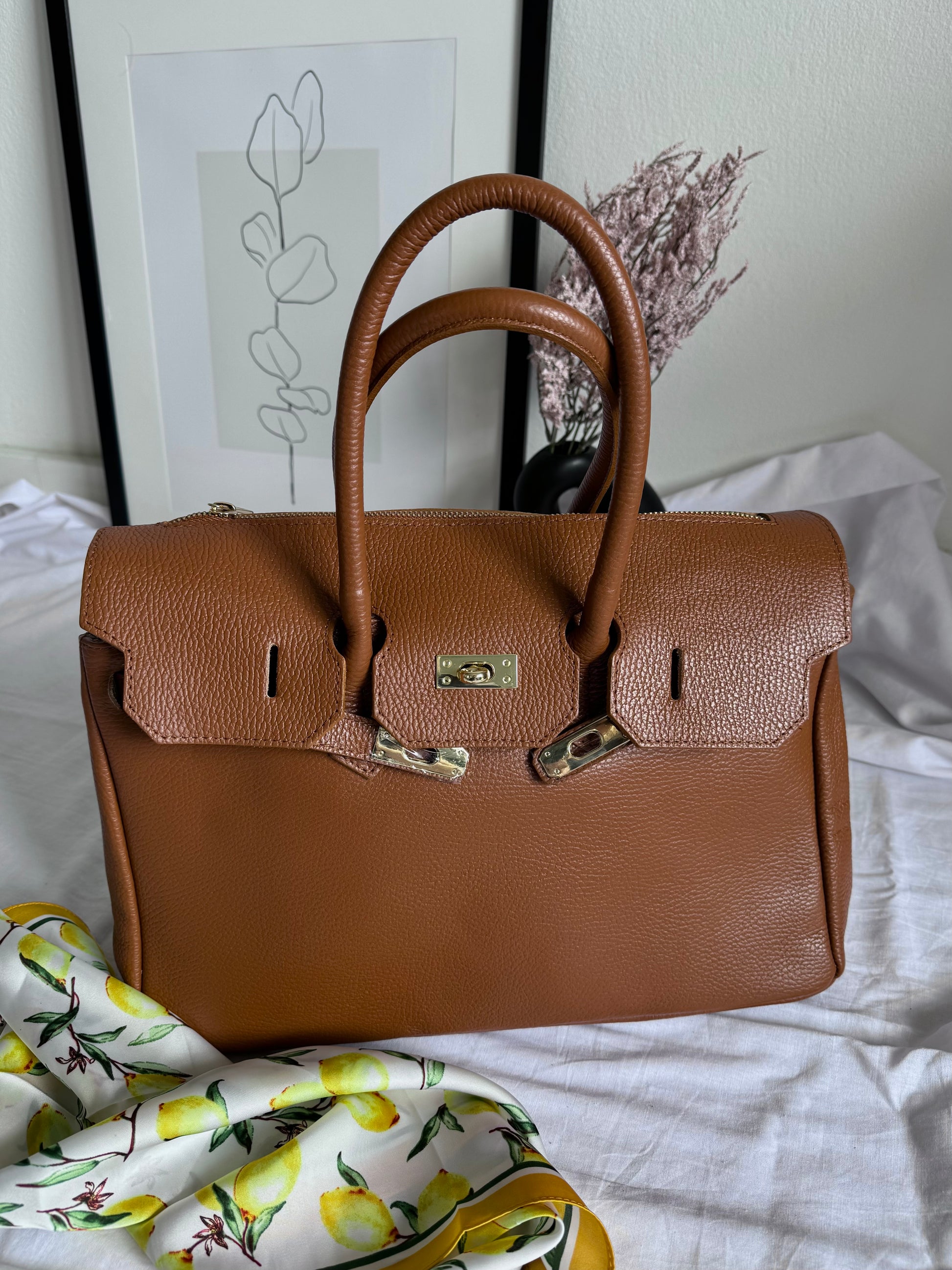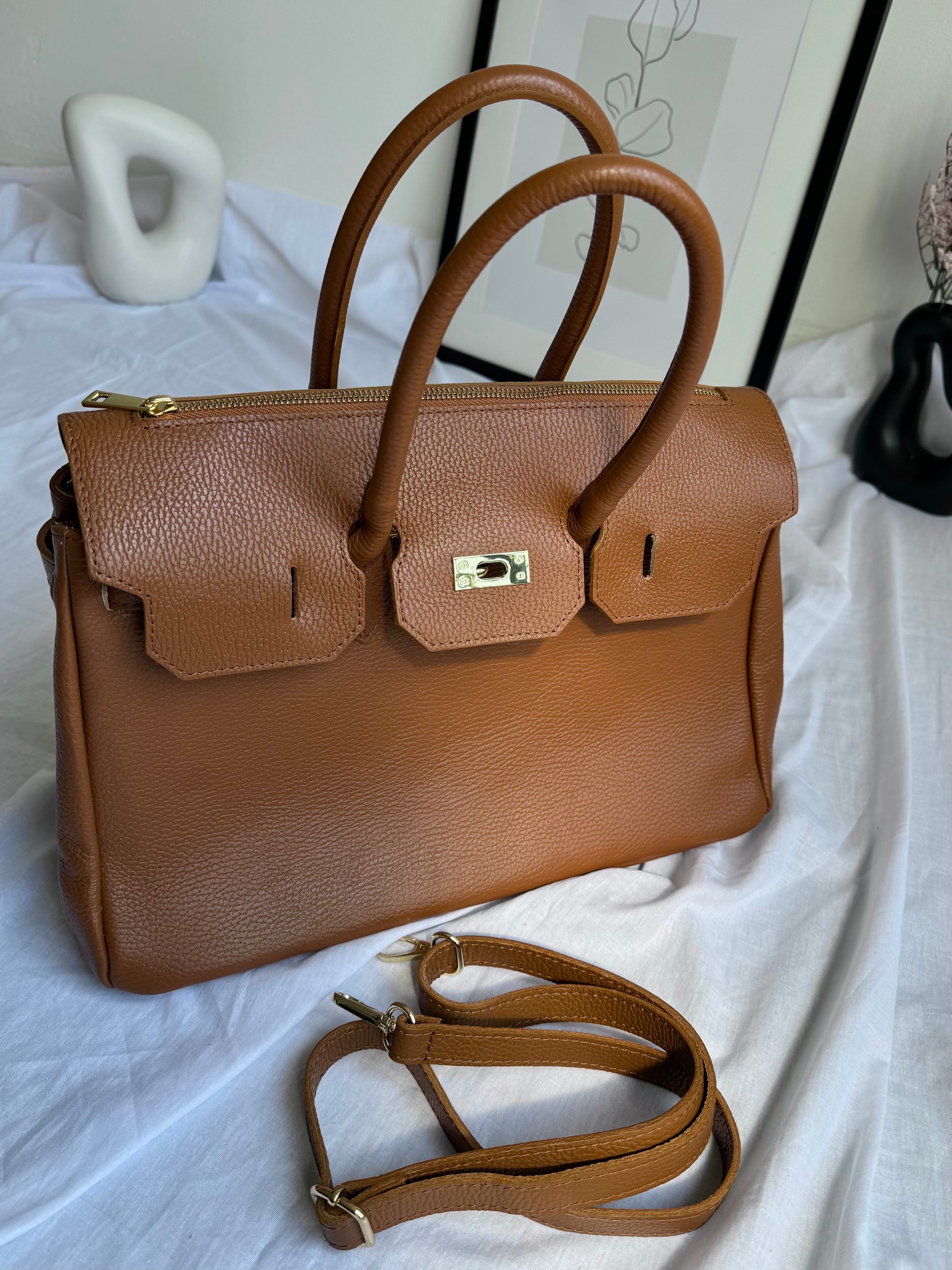 Ponadczasowa i elegancka torebka damska wykonana w całości z najwyższej jakości włoskiej skóry naturalnej (genuine leather / vera pelle). Ciepły odcień cognac nadaje jej klasy i wyjątkowego charakteru, a złote okucia subtelnie podkreślają luksusowy wygląd.