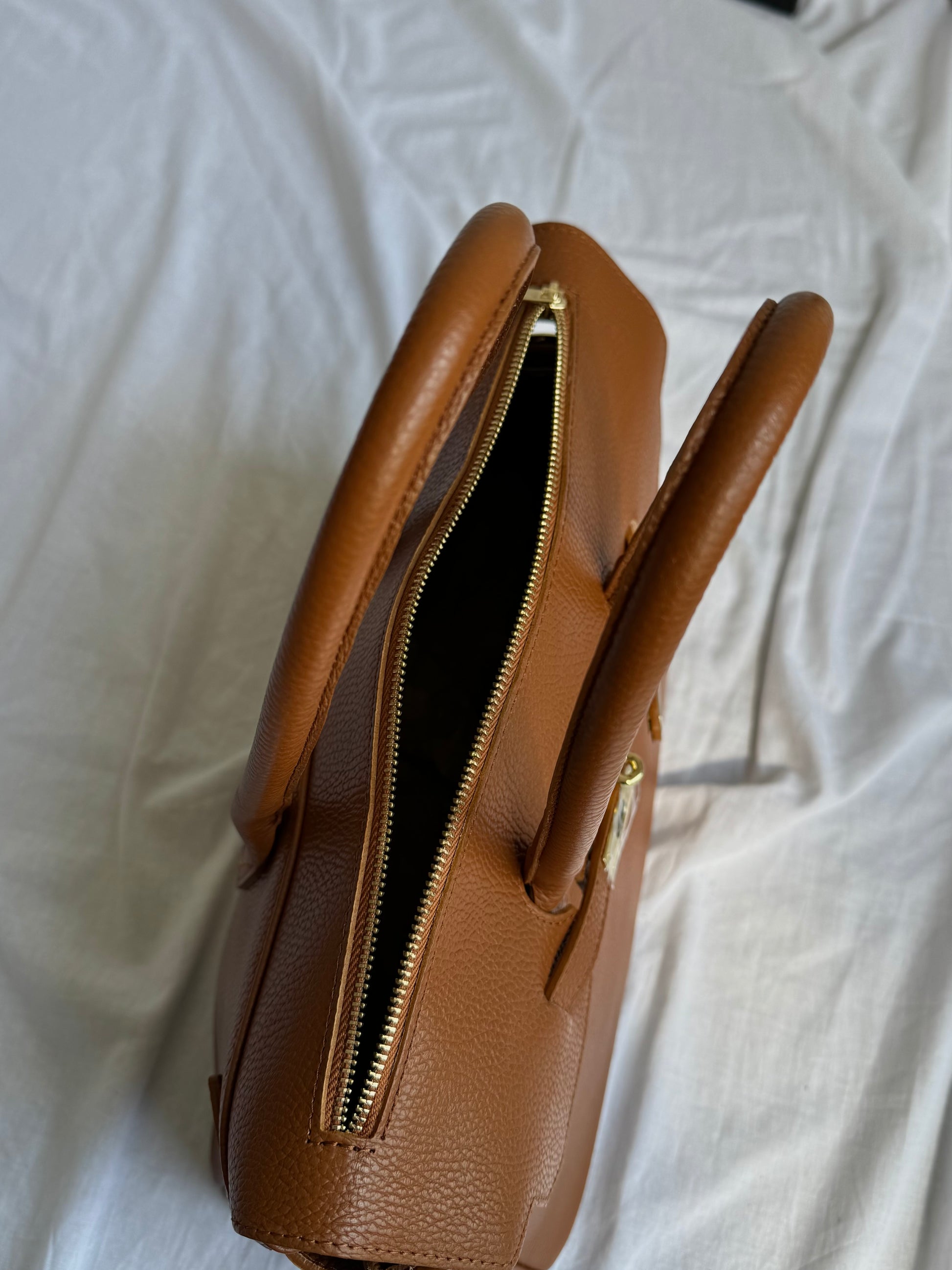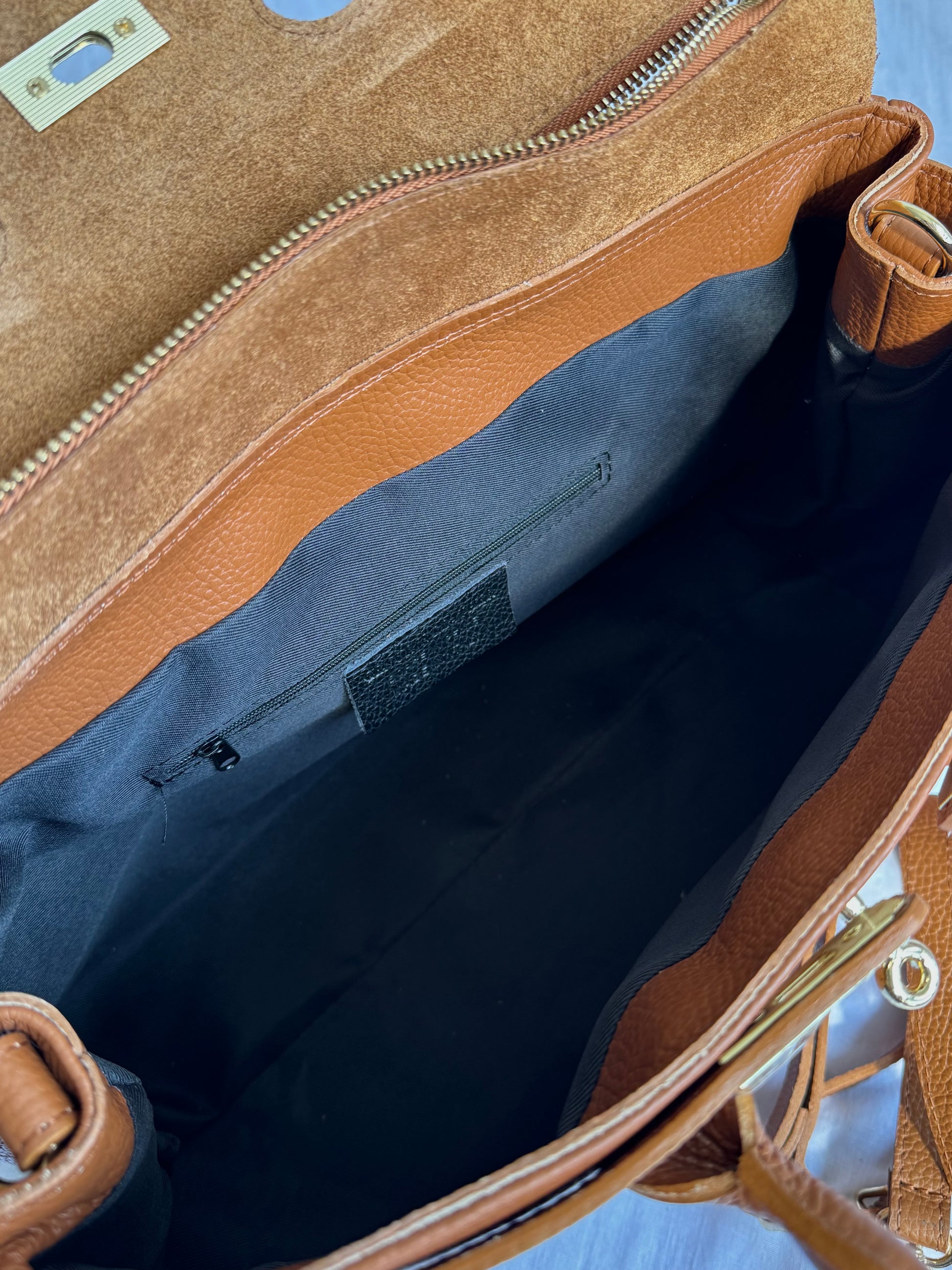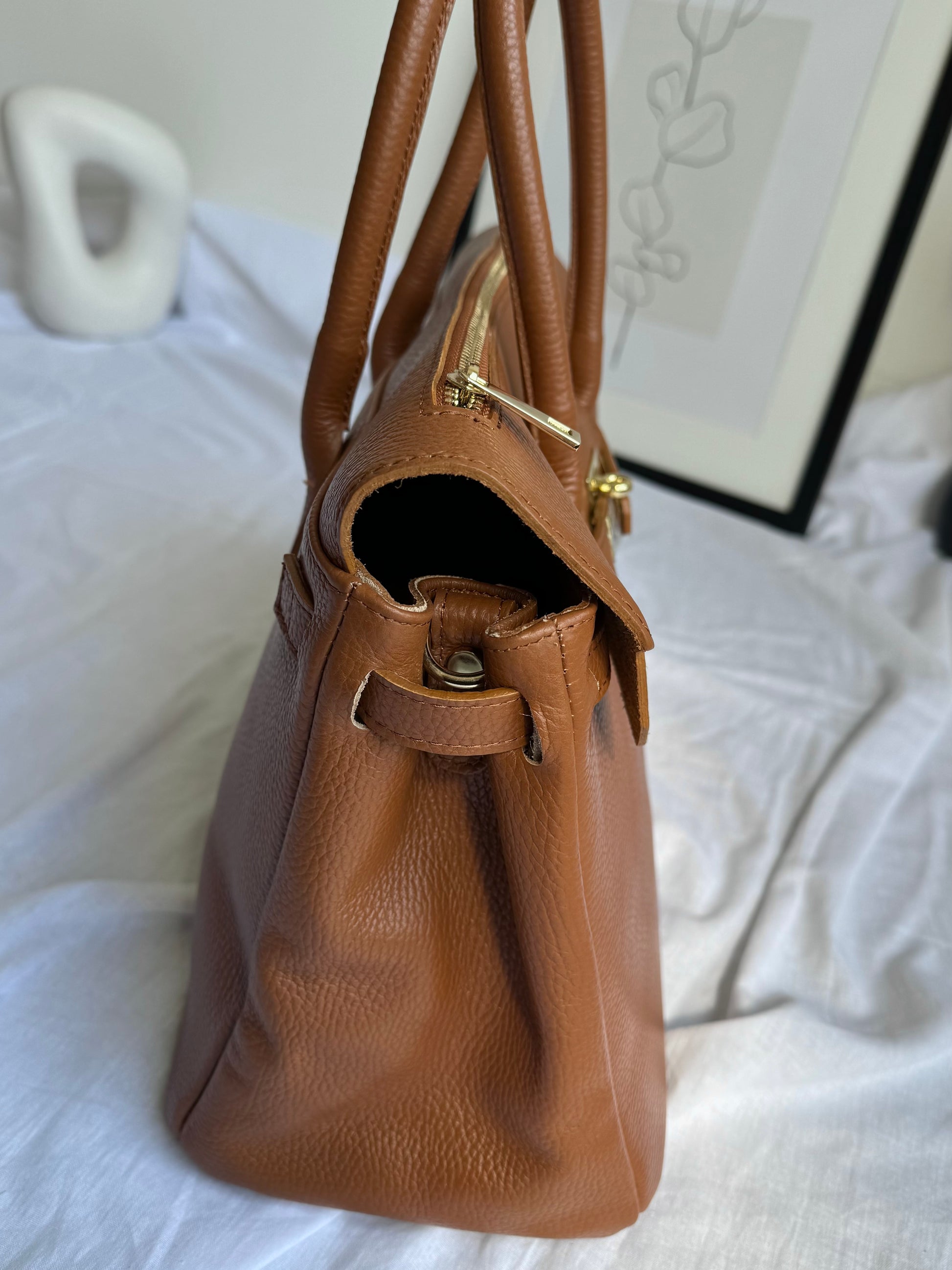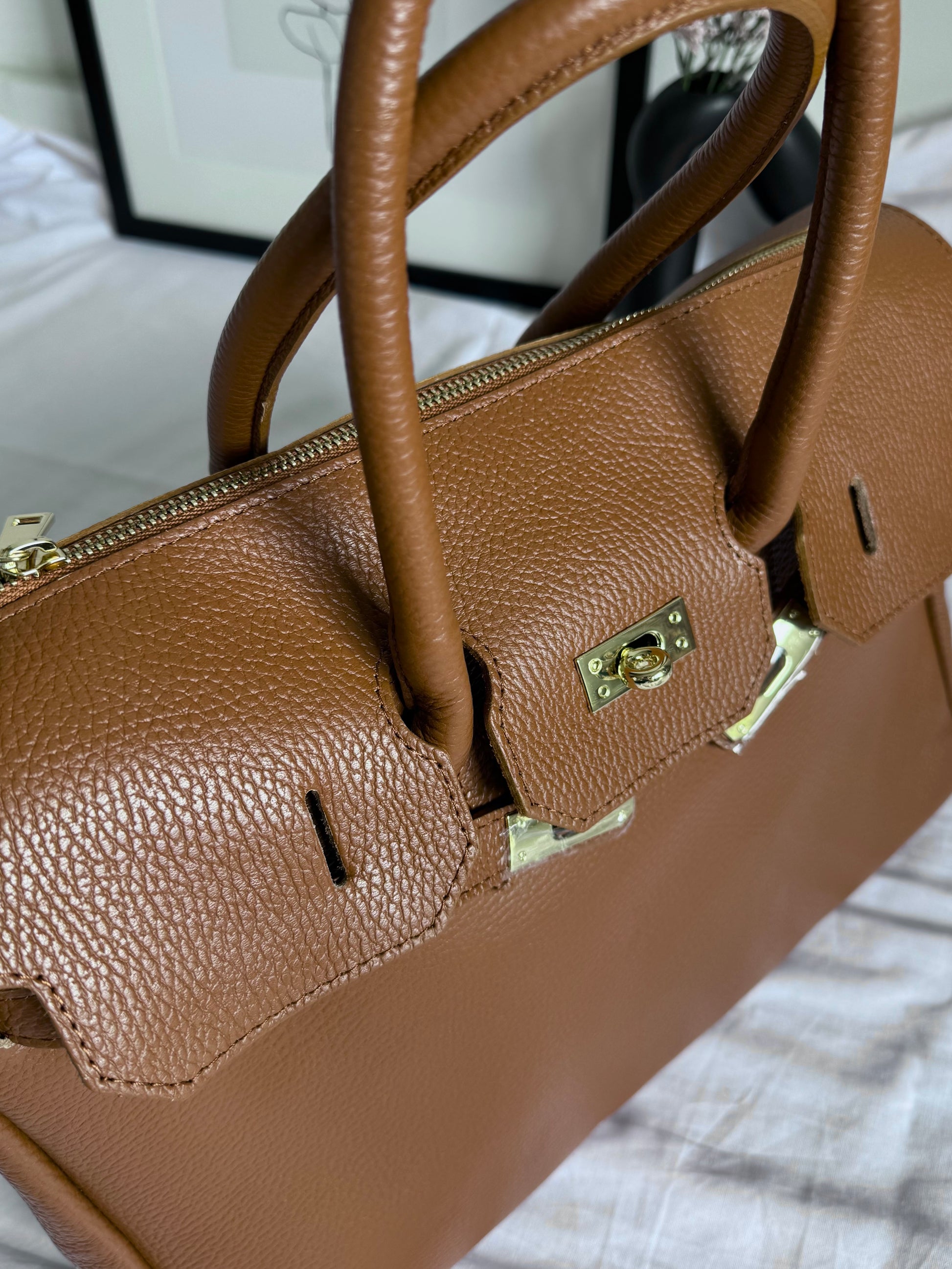 Ponadczasowa i elegancka torebka damska wykonana w całości z najwyższej jakości włoskiej skóry naturalnej (genuine leather / vera pelle). Ciepły odcień cognac nadaje jej klasy i wyjątkowego charakteru, a złote okucia subtelnie podkreślają luksusowy wygląd.