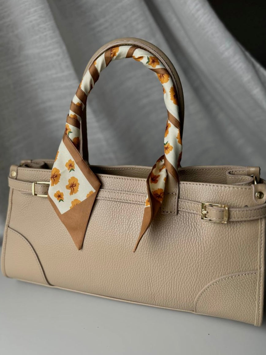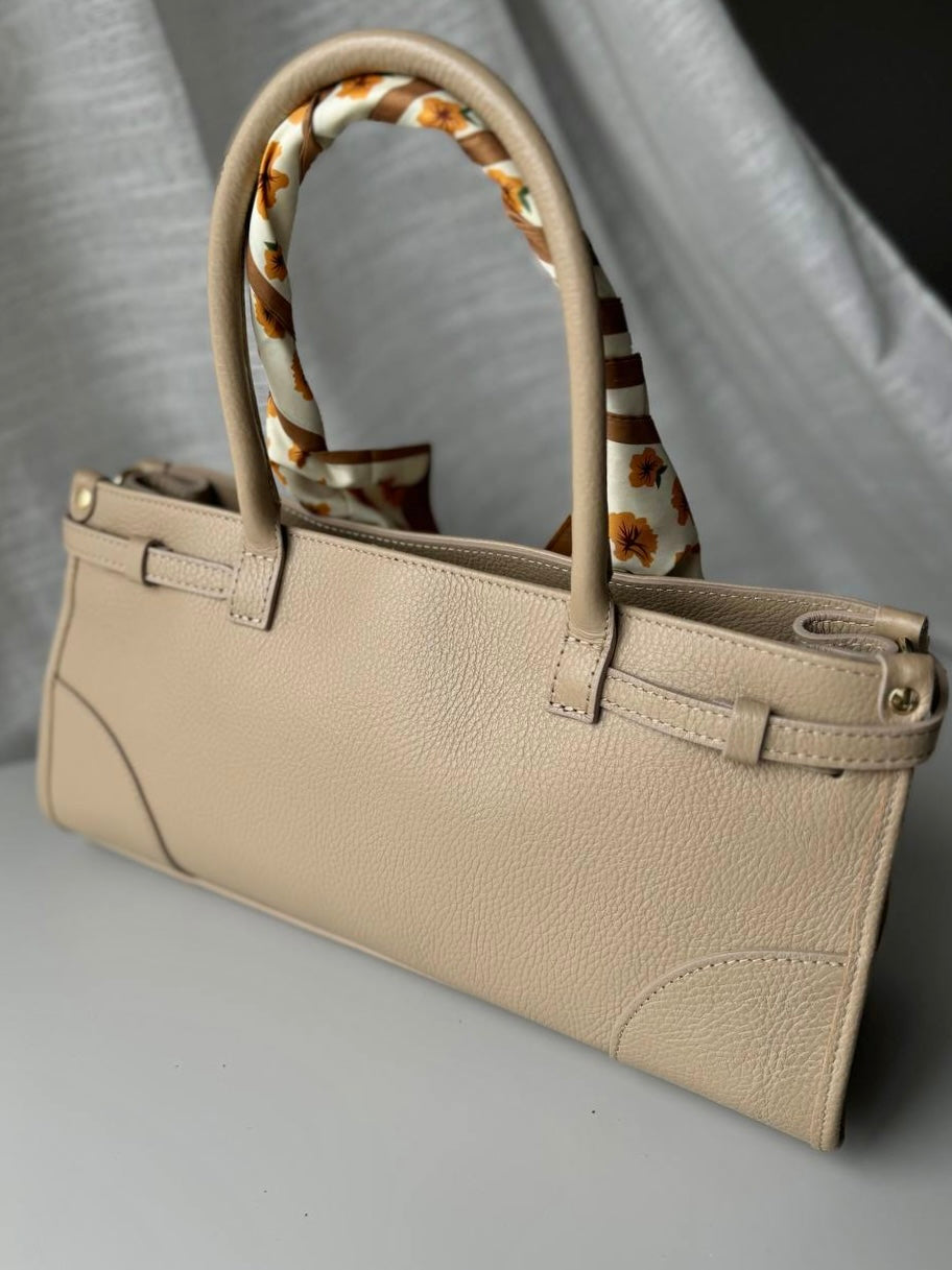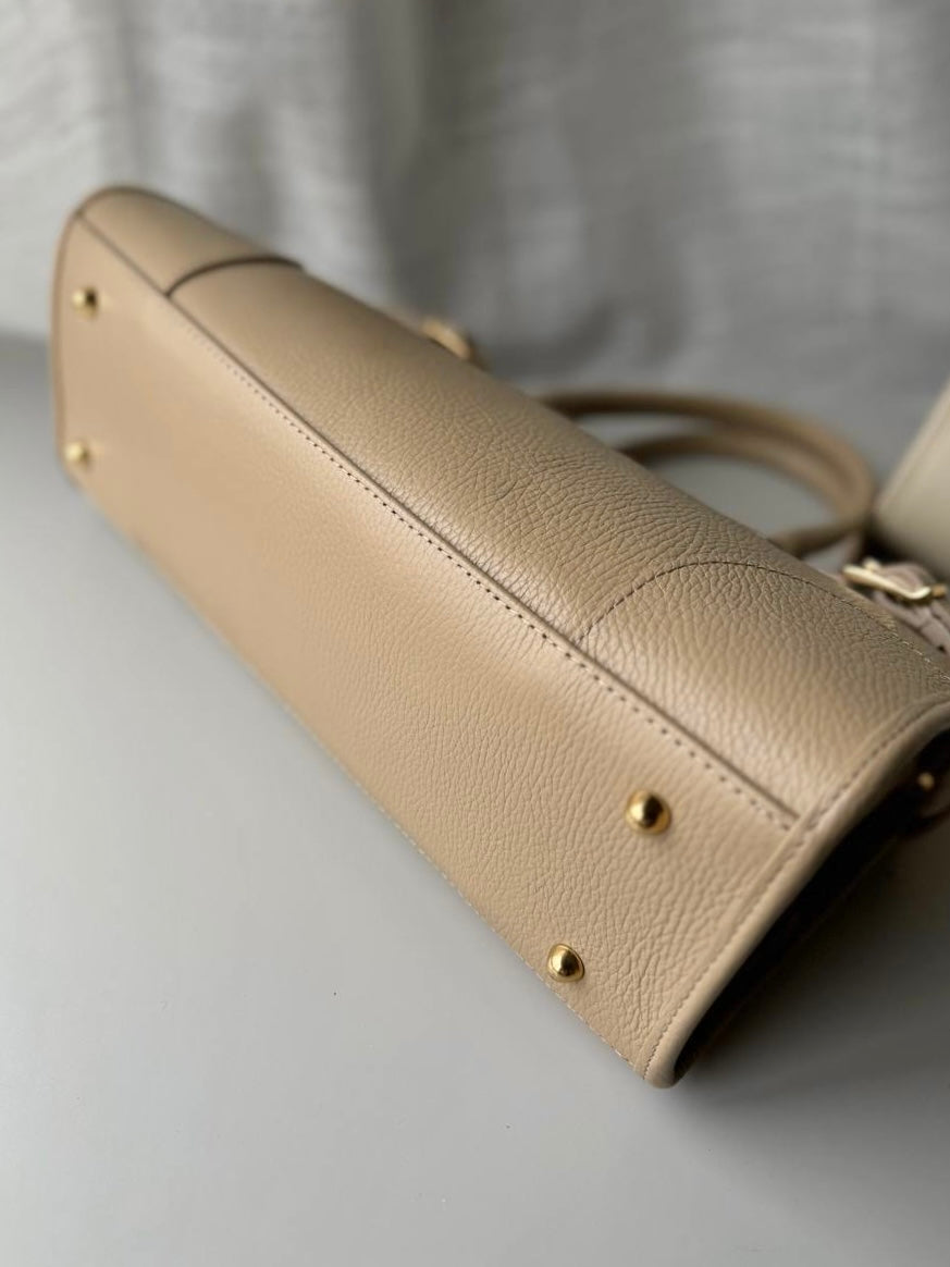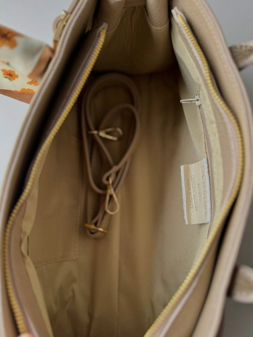 wykonana w całości z najwyższej jakości skóry naturalnej (genuine leather / vera pelle). Subtelny beżowy kolor nadaje jej lekkości i klasy, sprawiając, że doskonale komponuje się zarówno z codziennymi, jak i eleganckimi stylizacjami.