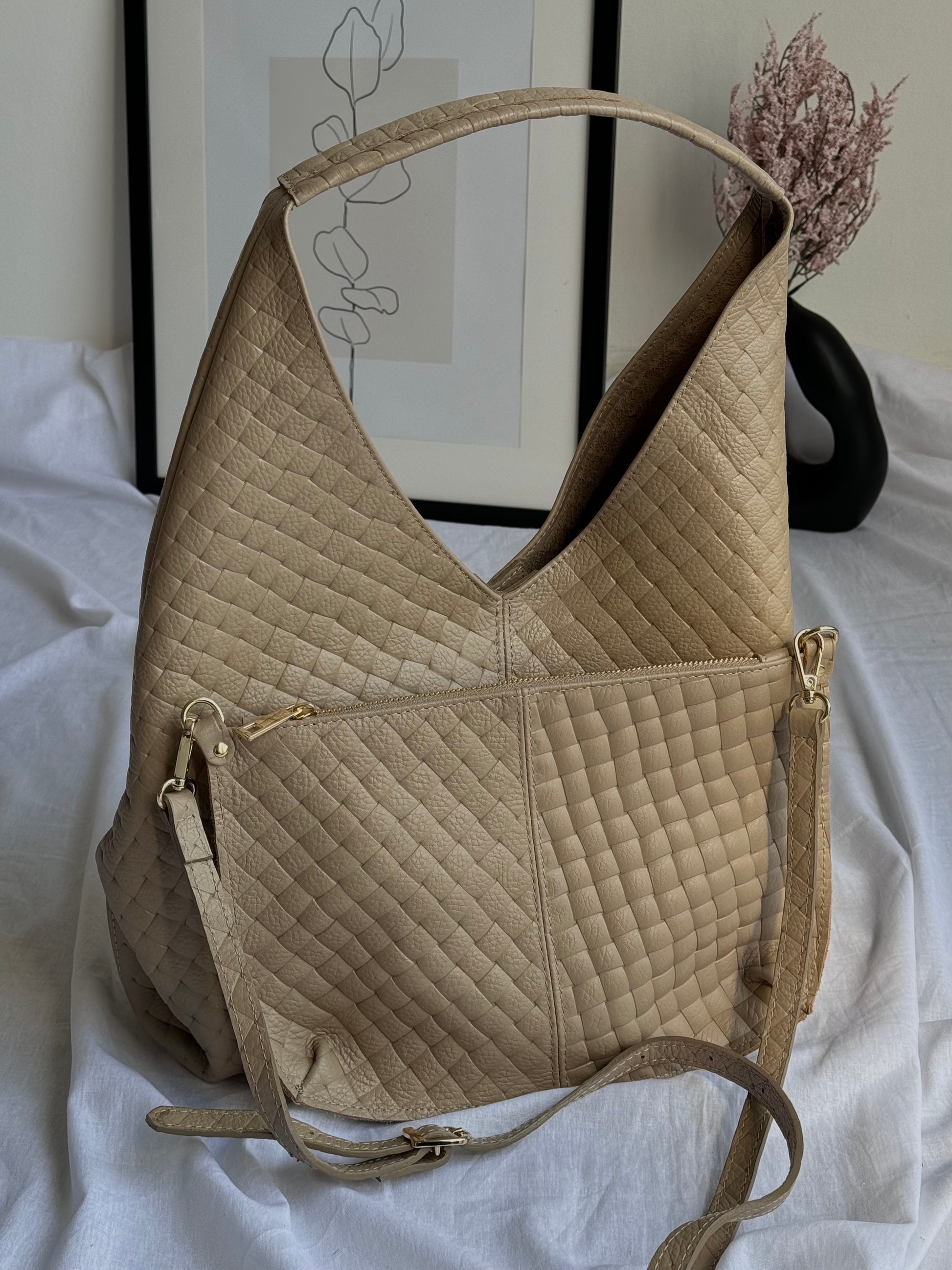 Wyjątkowa, duża torebka damska wykonana z najwyższej jakości włoskiej skóry naturalnej (genuine leather / vera pelle). Jej charakterystyczny pleciony wzór nadaje jej nowoczesnego, a jednocześnie ponadczasowego charakteru. To model, który łączy w sobie elegancję i funkcjonalność – idealny zarówno na co dzień, jak i na specjalne okazje.