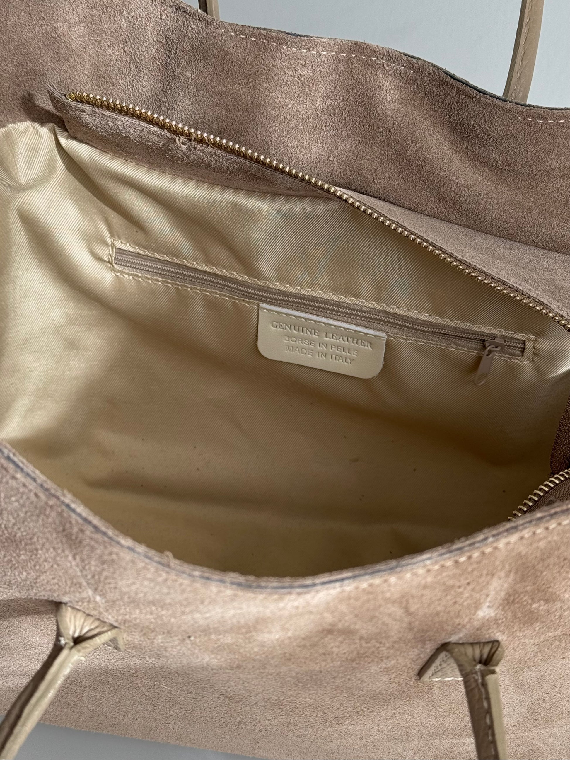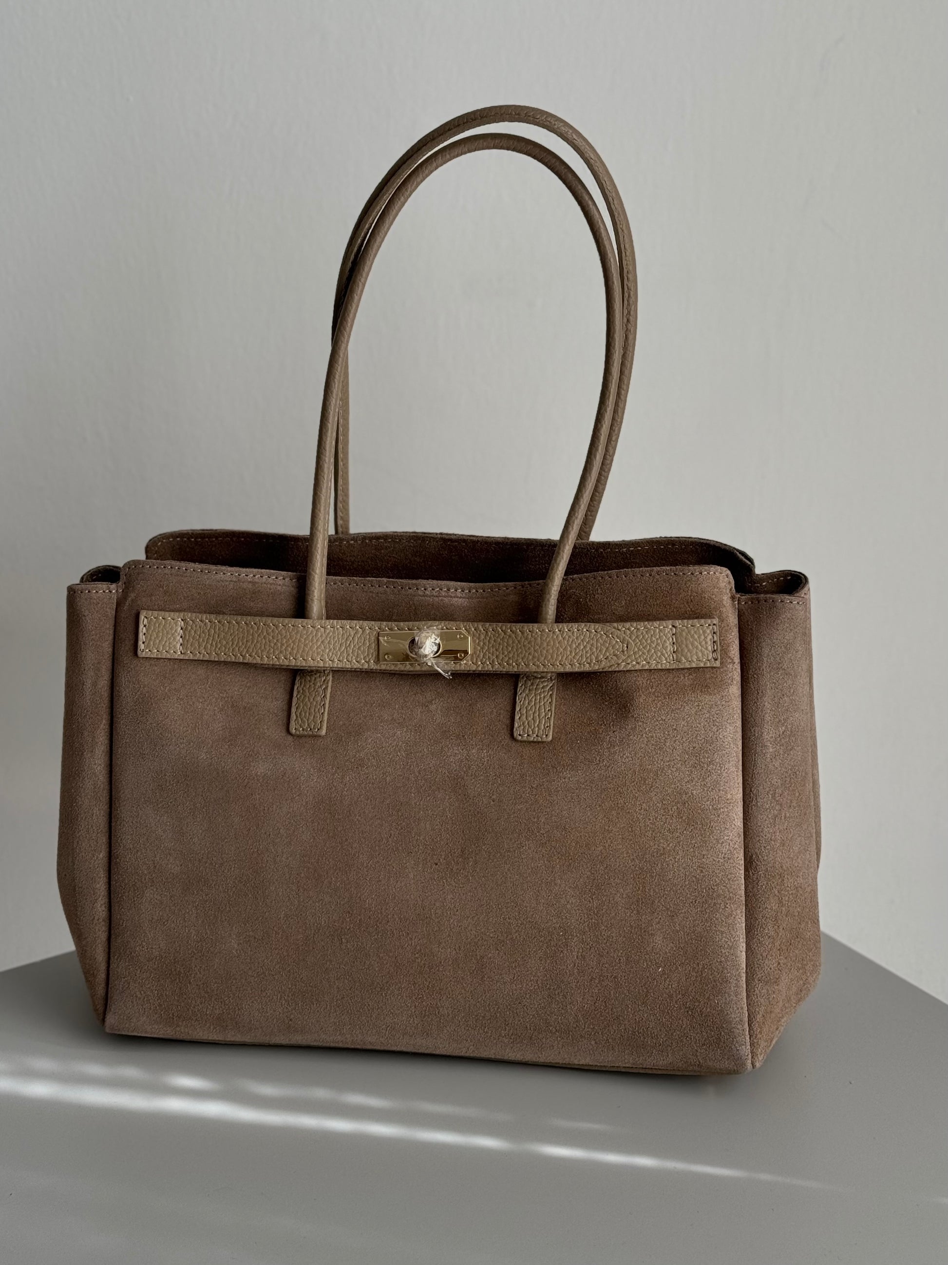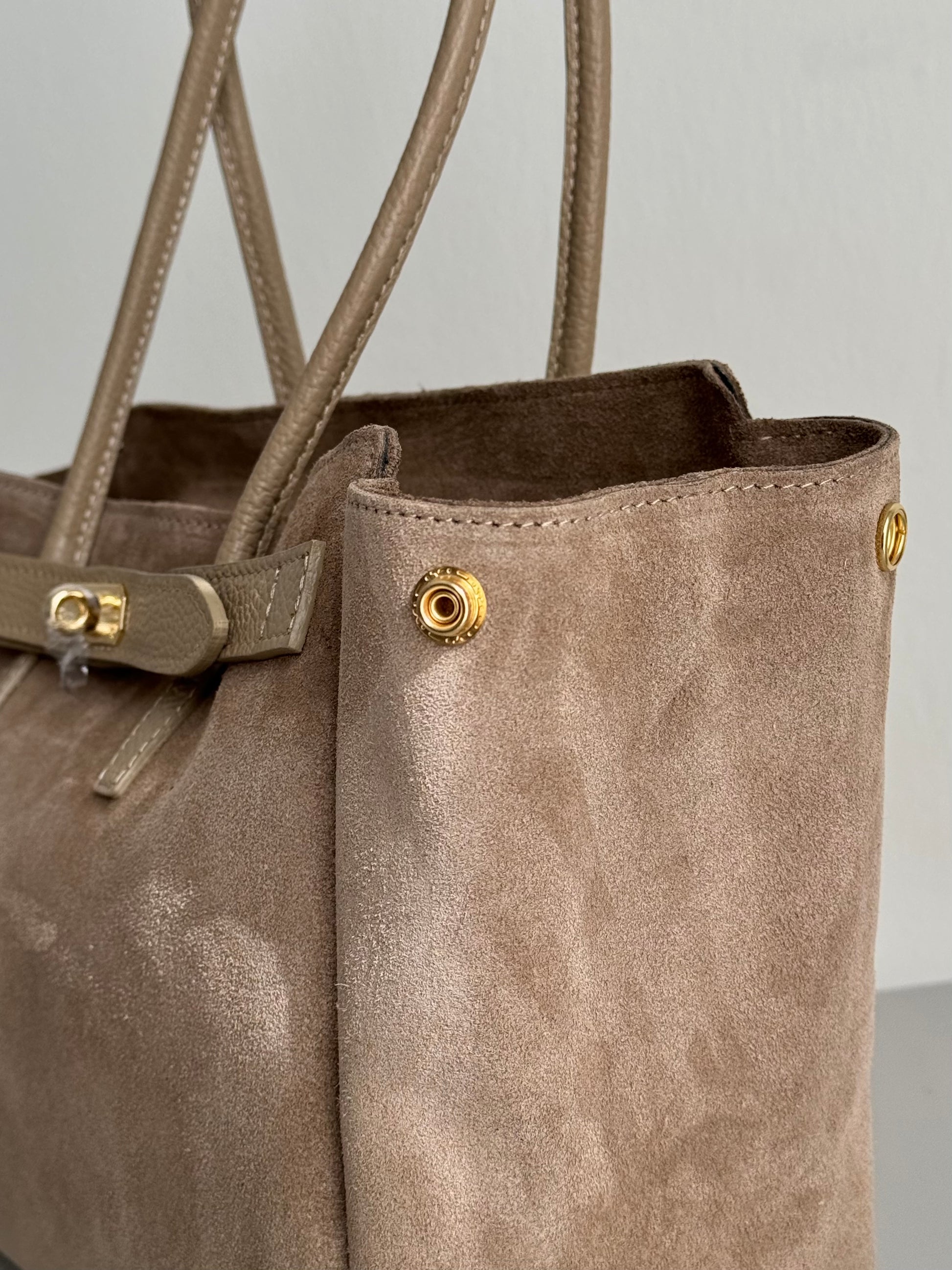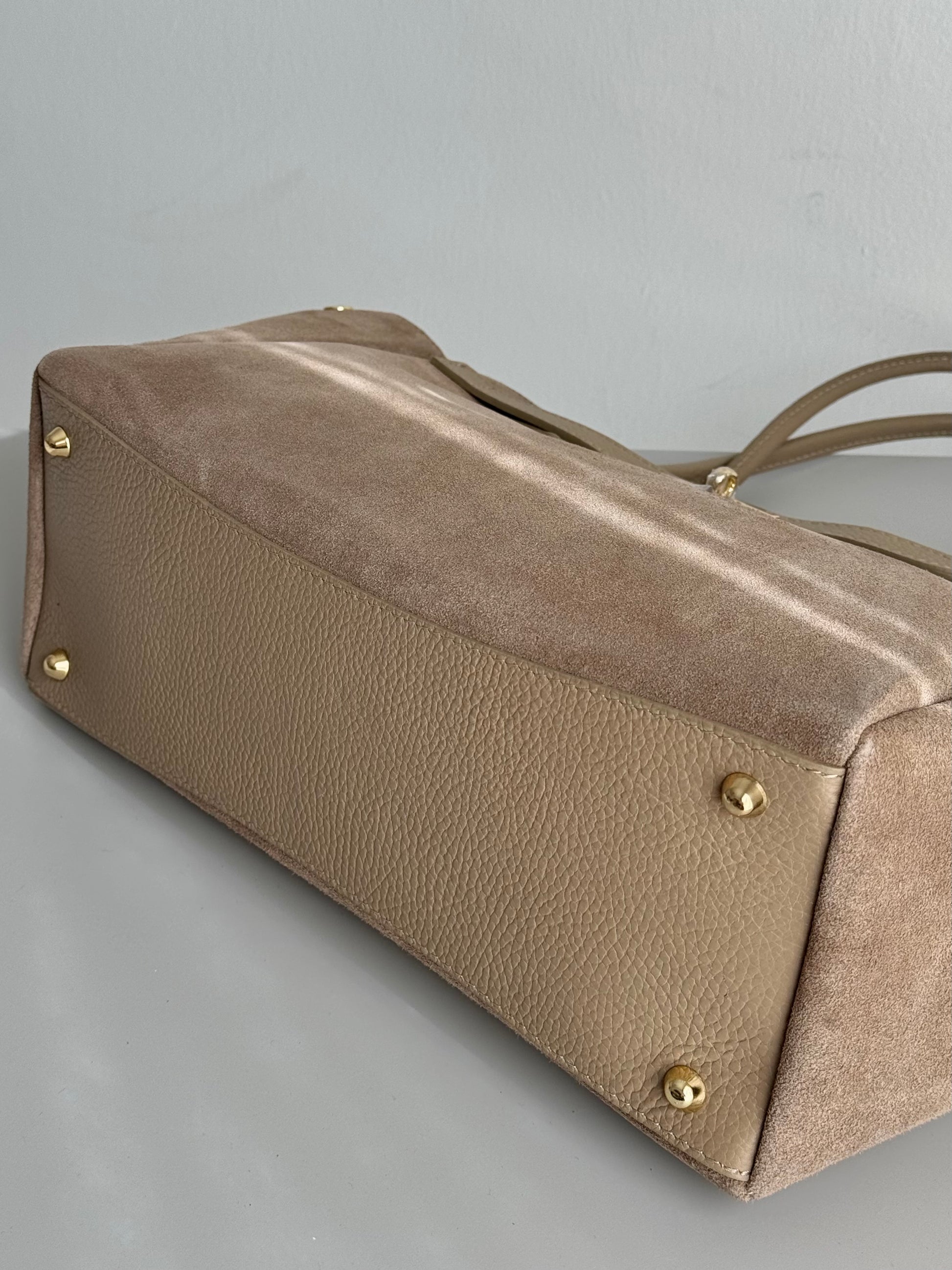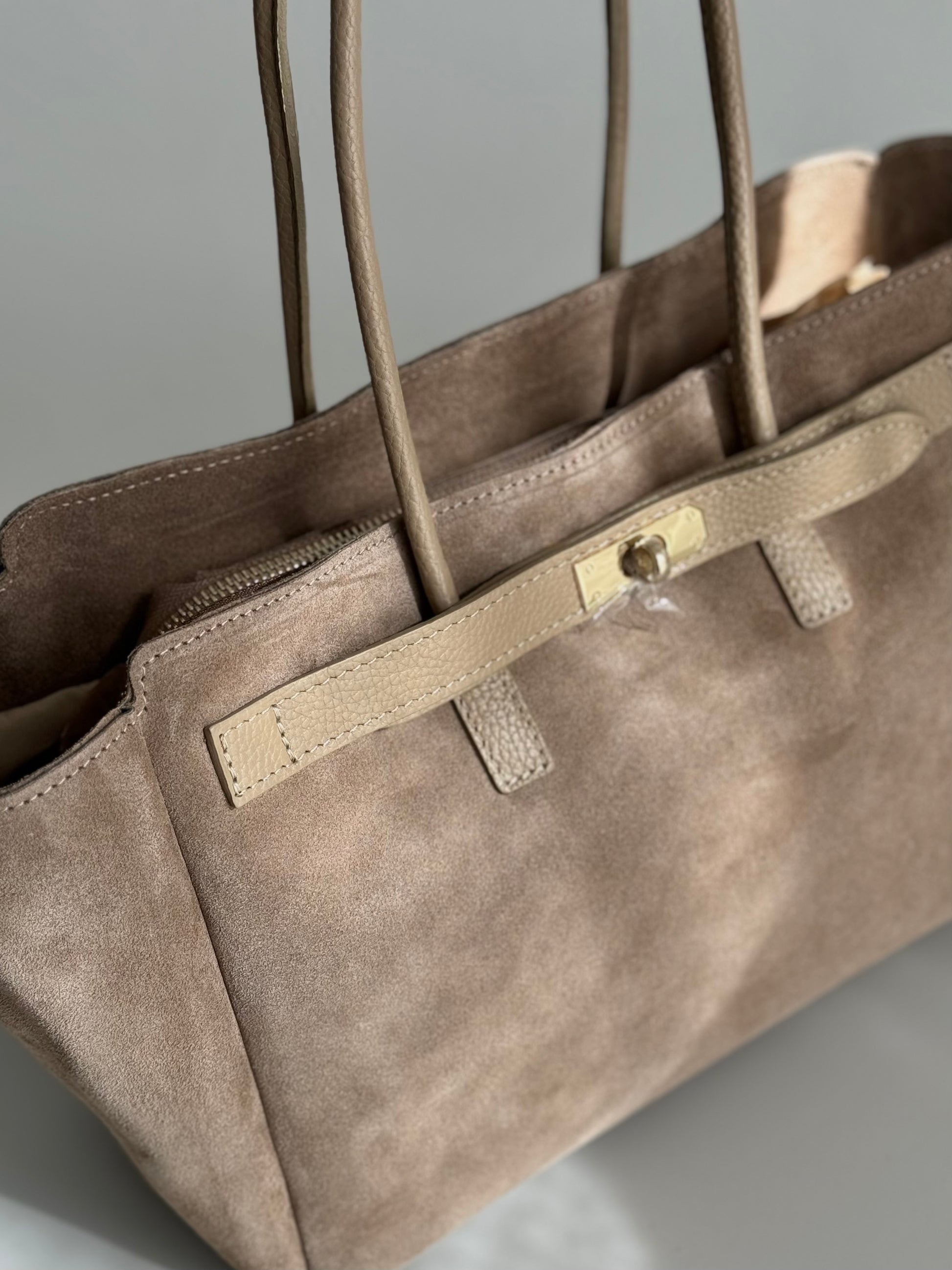 Wyjątkowa włoska torebka #art088 wykonana z połączenia naturalnej skóry (genuine leather / vera pelle) i miękkiego zamszu (pelle scamosciata). Elegancki kolor taupe chiaro nadaje jej subtelności i ponadczasowego charakteru, dzięki czemu świetnie sprawdzi się zarówno w codziennych, jak i eleganckich stylizacjach.
