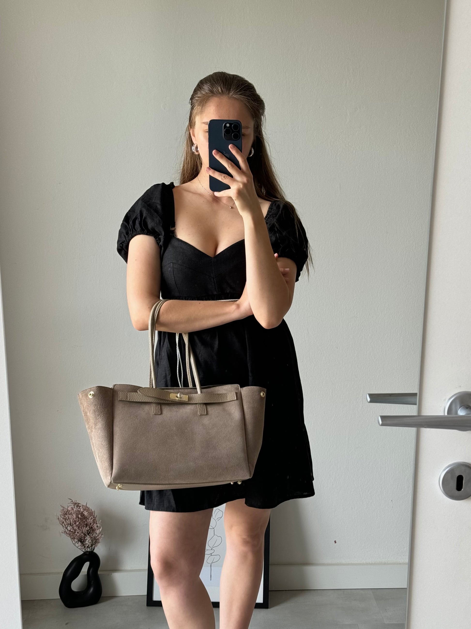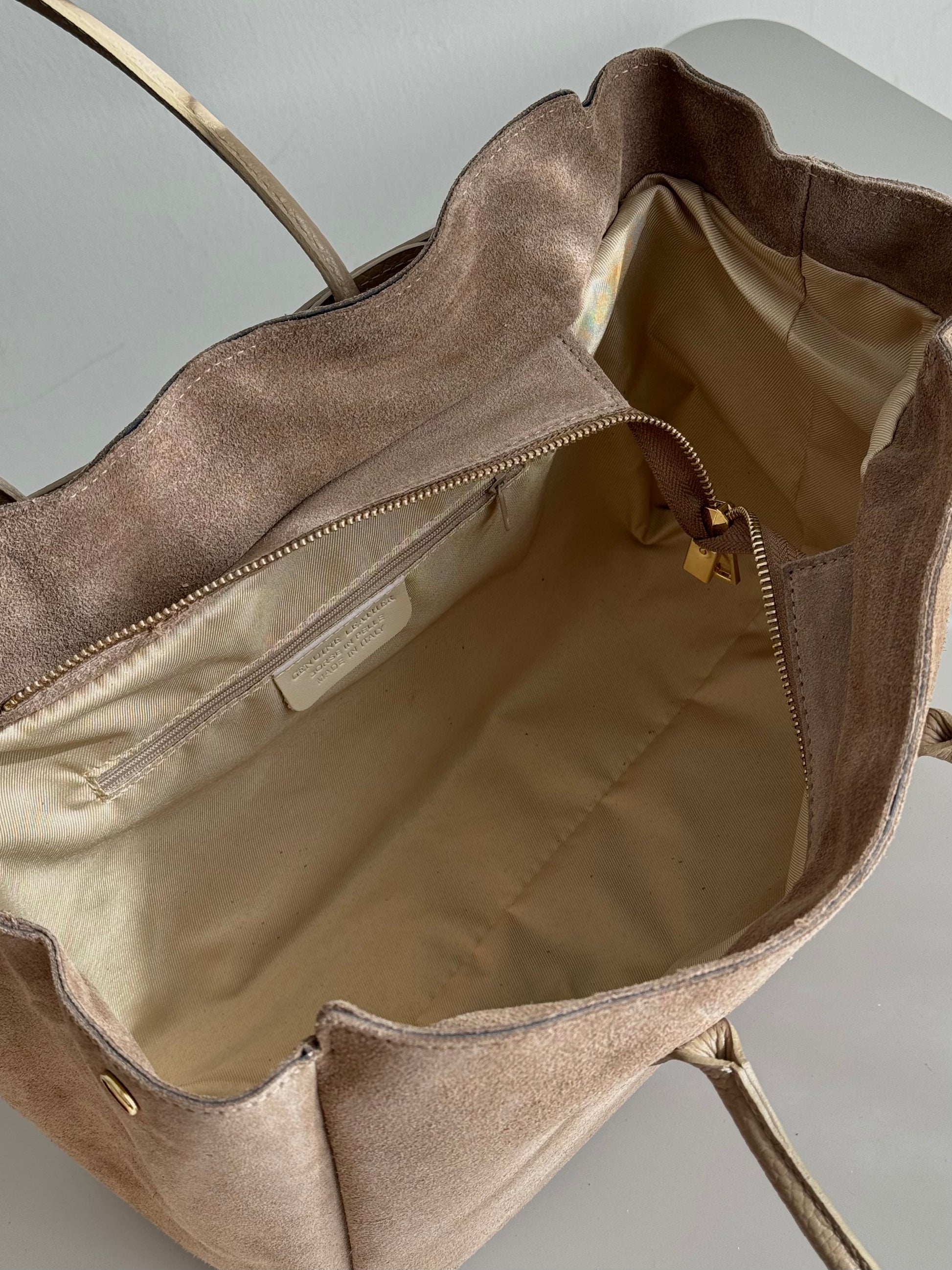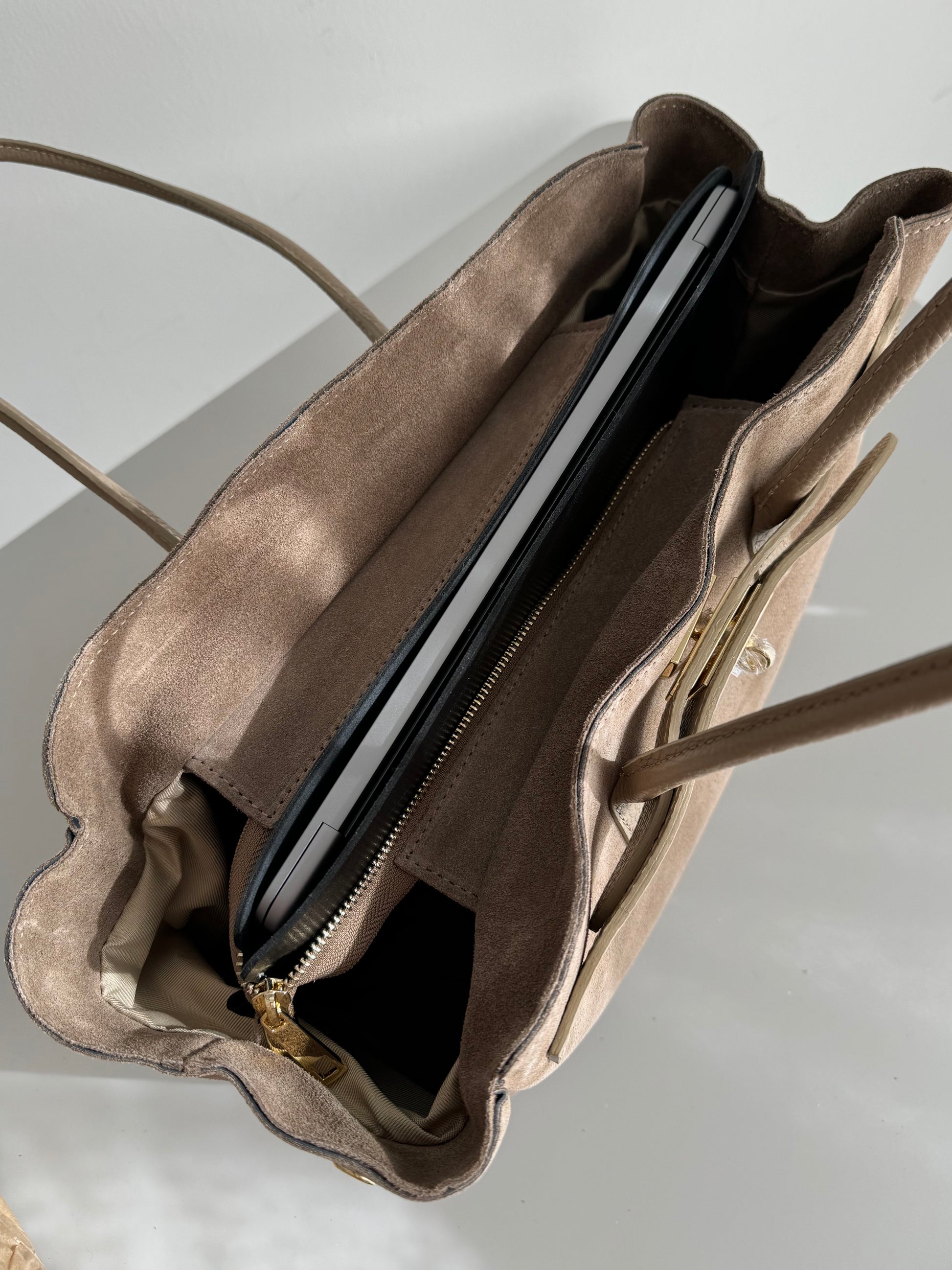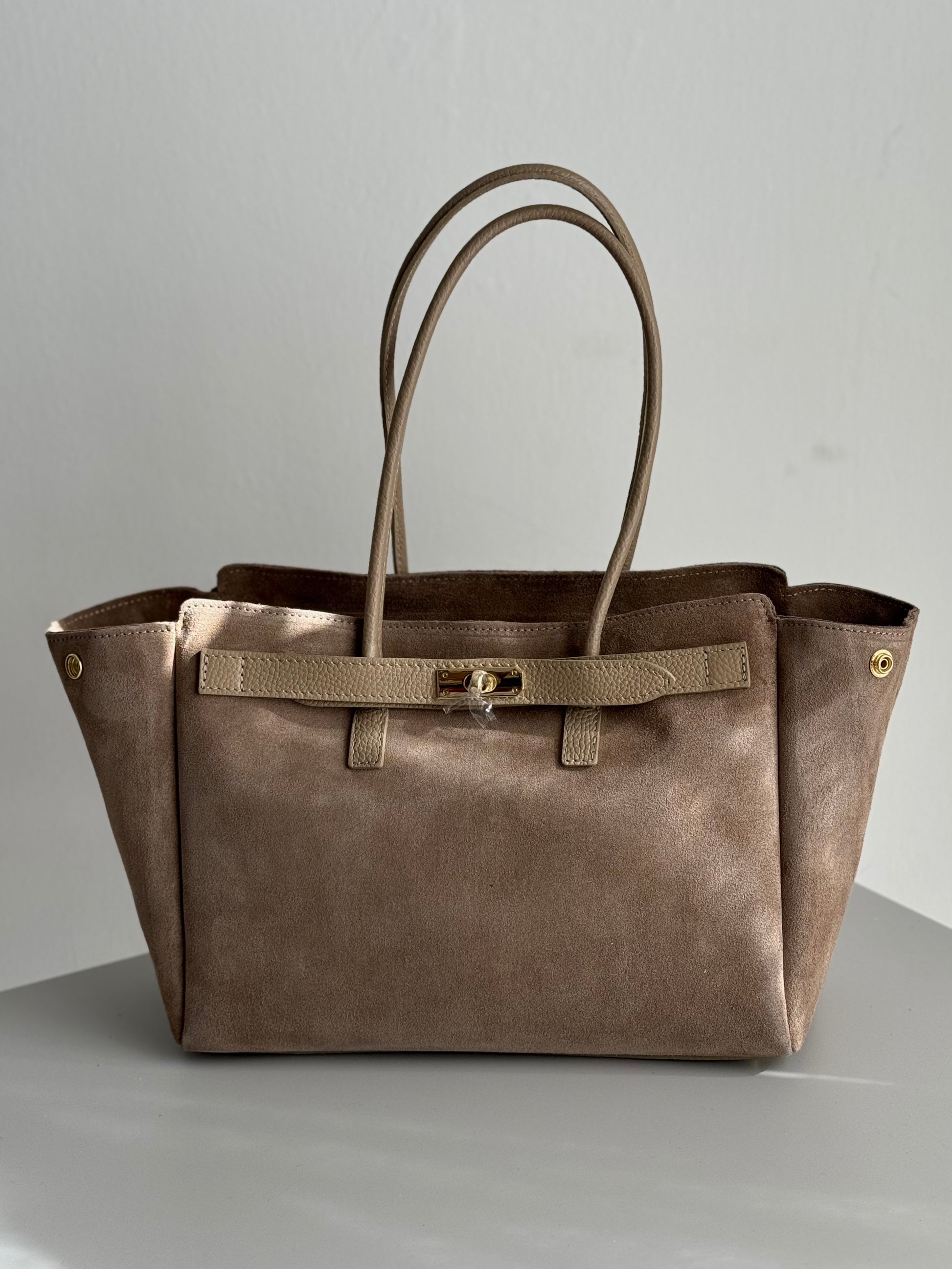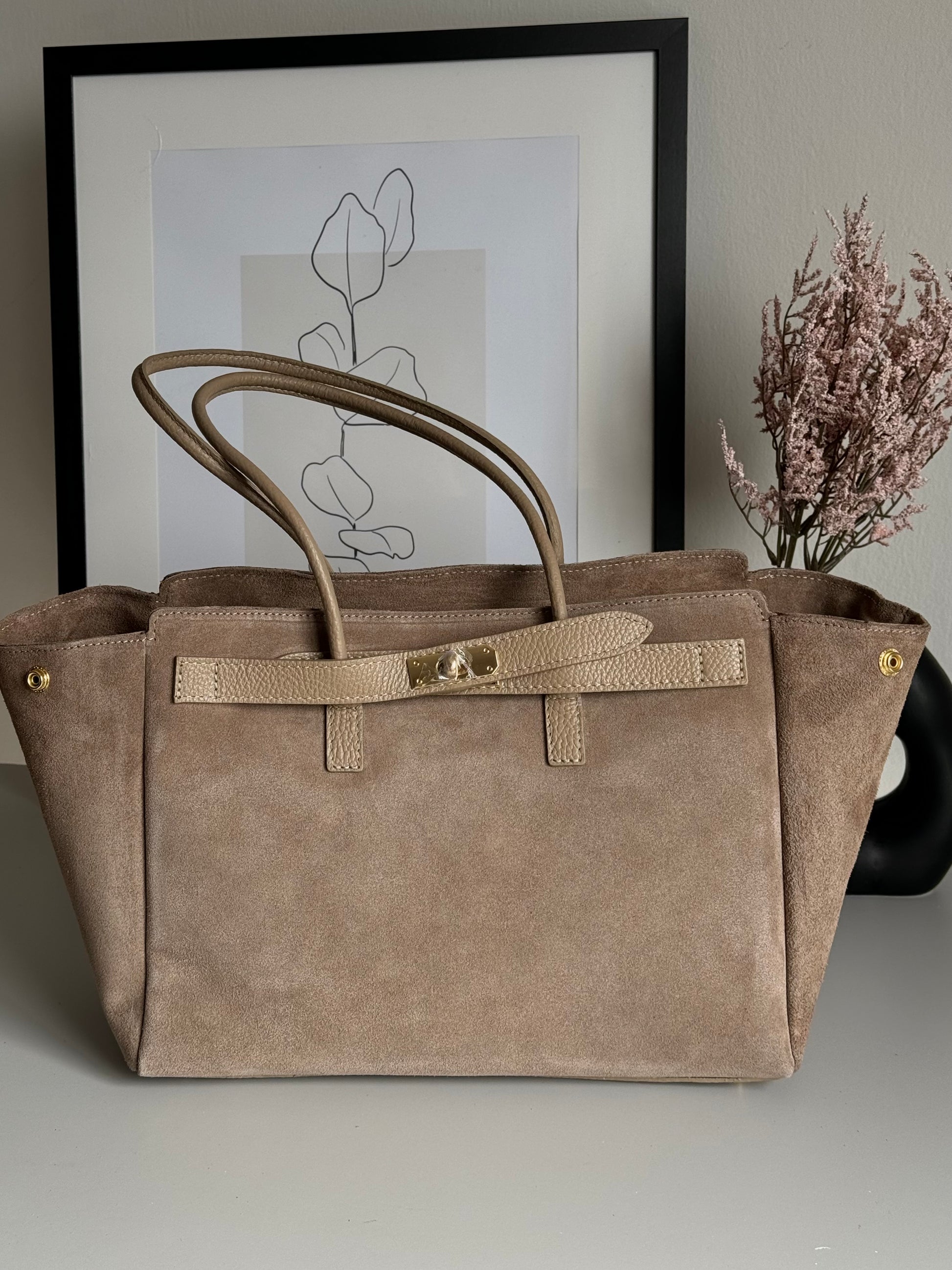 Wyjątkowa włoska torebka #art088 wykonana z połączenia naturalnej skóry (genuine leather / vera pelle) i miękkiego zamszu (pelle scamosciata). Elegancki kolor taupe chiaro nadaje jej subtelności i ponadczasowego charakteru, dzięki czemu świetnie sprawdzi się zarówno w codziennych, jak i eleganckich stylizacjach.
