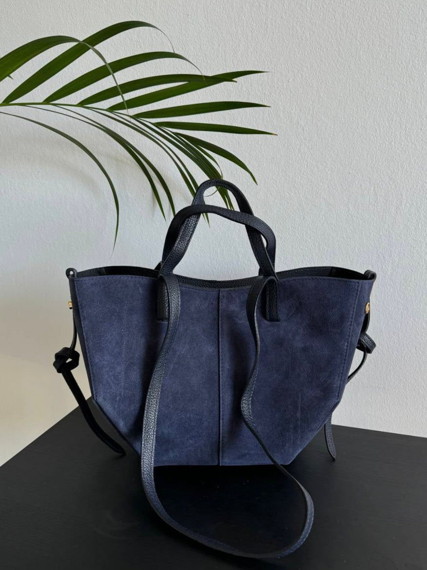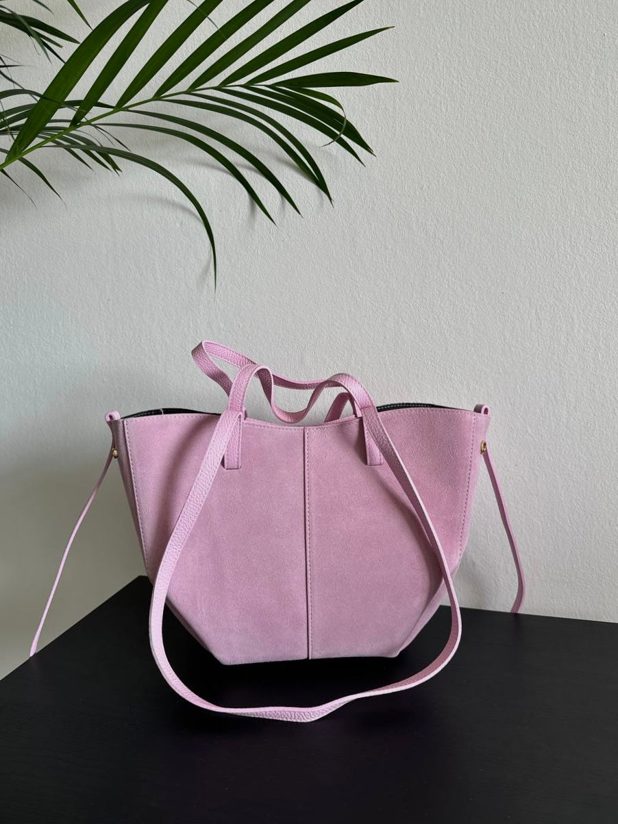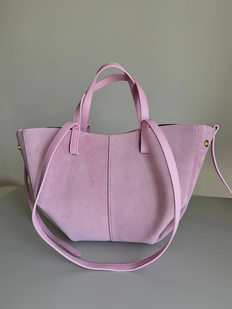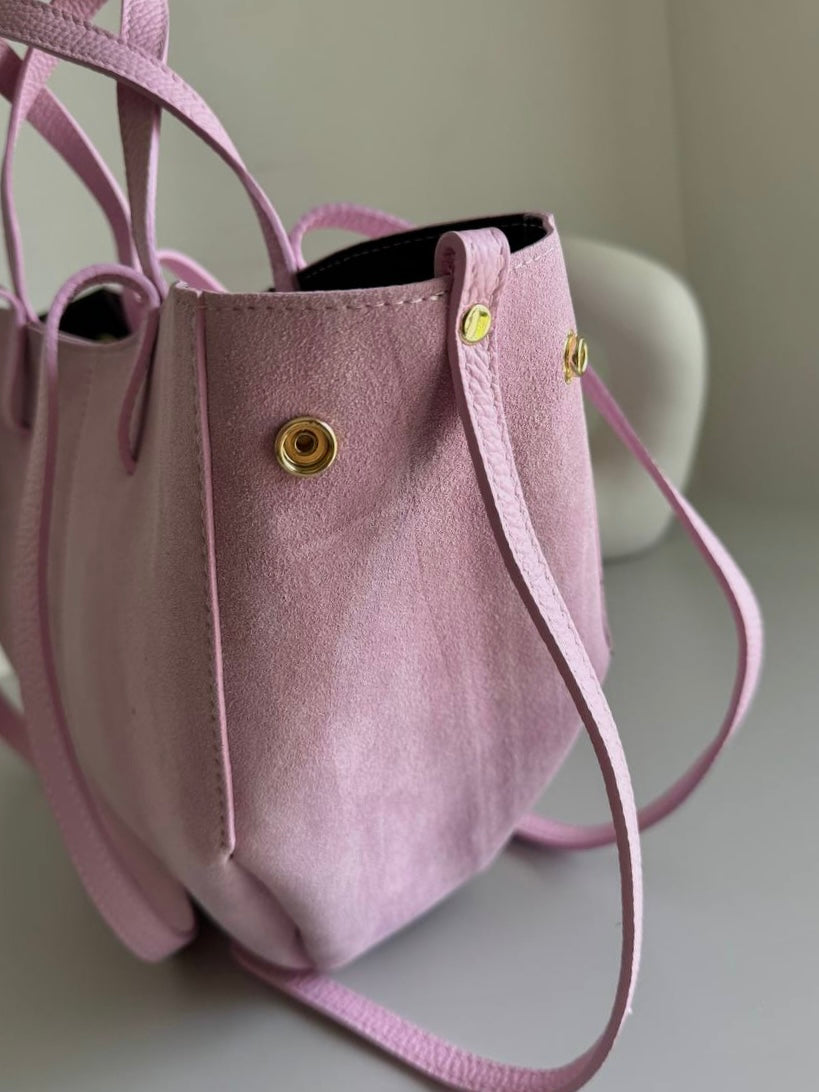 - Na zewnątrz – miękka i szlachetna skóra zamszowa, która nadaje torebce subtelnej elegancji i ponadczasowego charakteru.