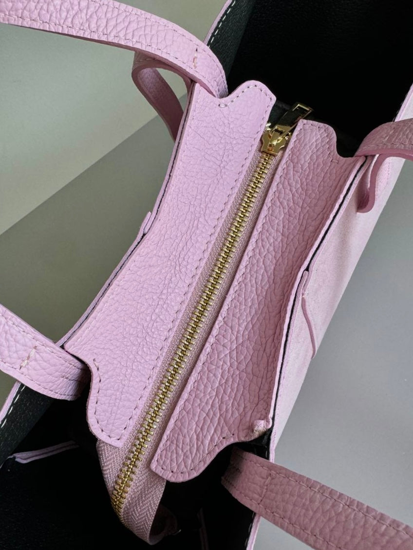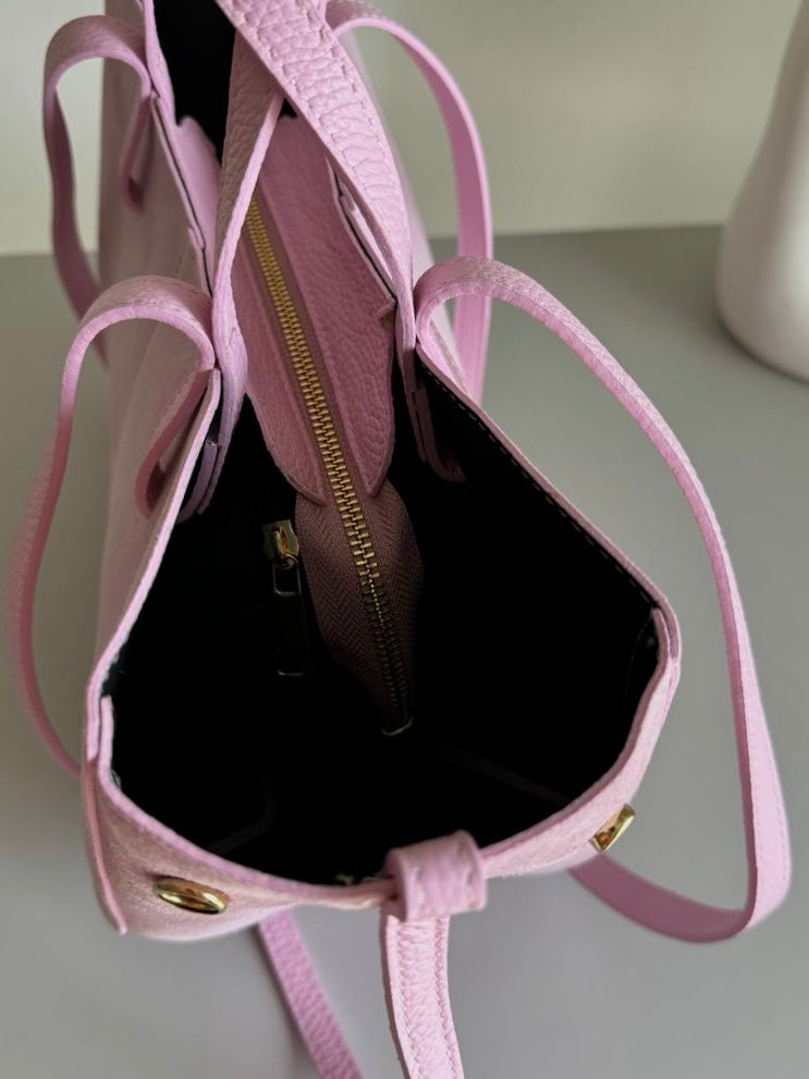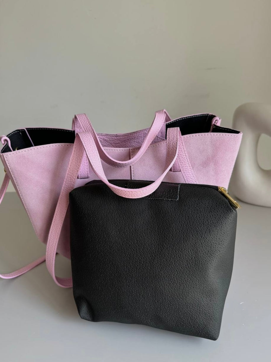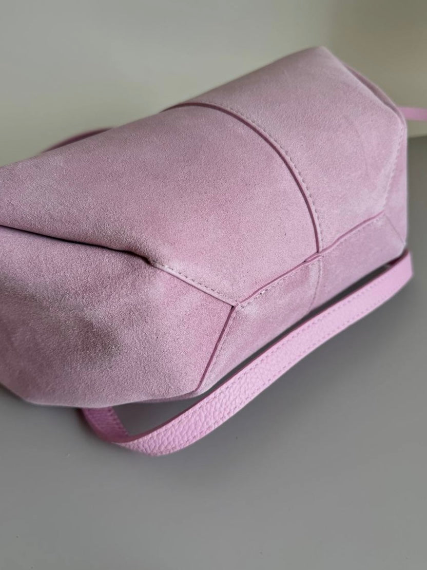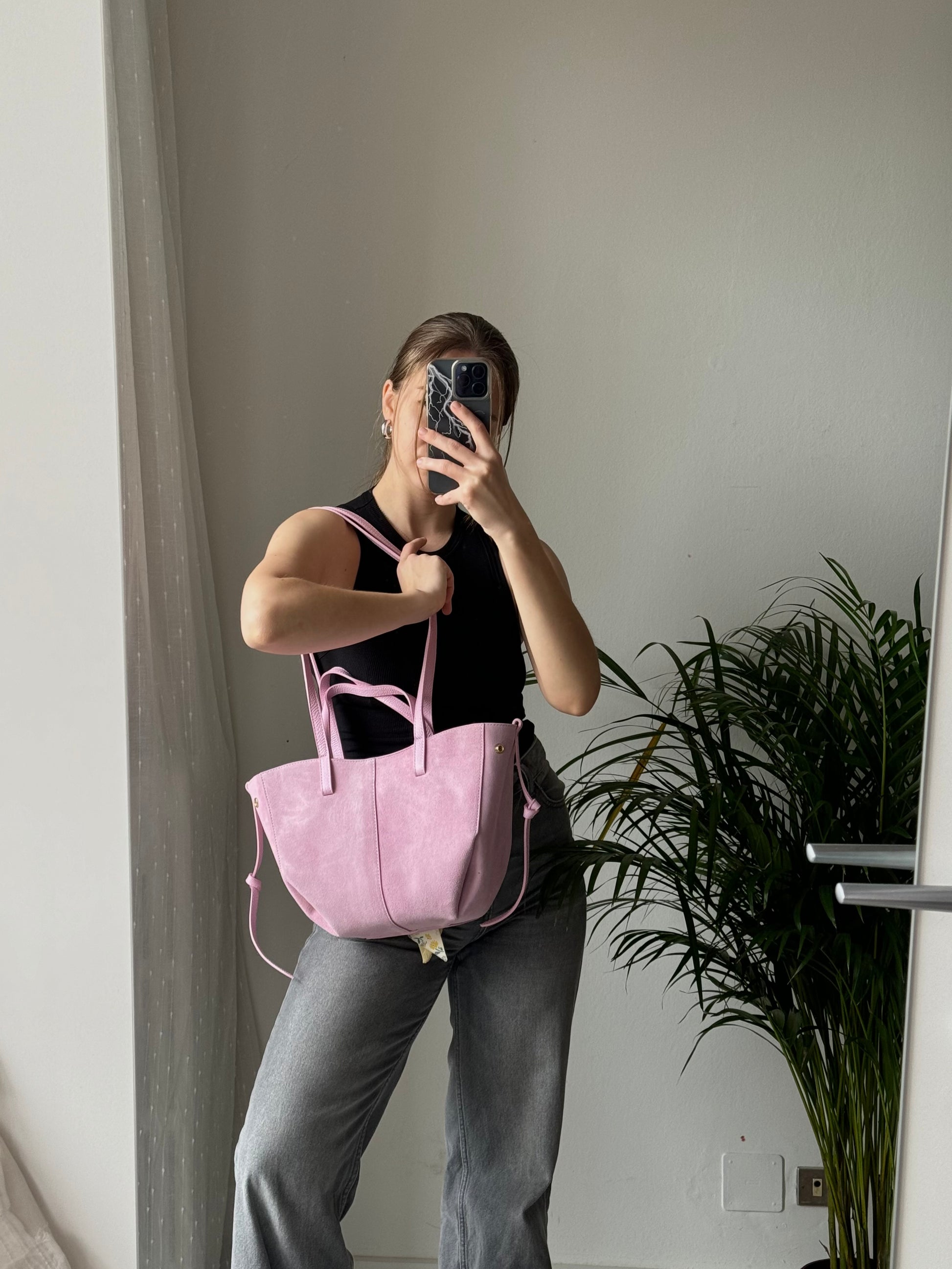 - Na zewnątrz – miękka i szlachetna skóra zamszowa, która nadaje torebce subtelnej elegancji i ponadczasowego charakteru.
