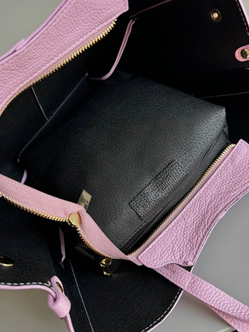 - Wewnętrzny element – praktyczna, wyjmowana kosmetyczka z eko-skóry, idealna do przechowywania drobnych przedmiotów.