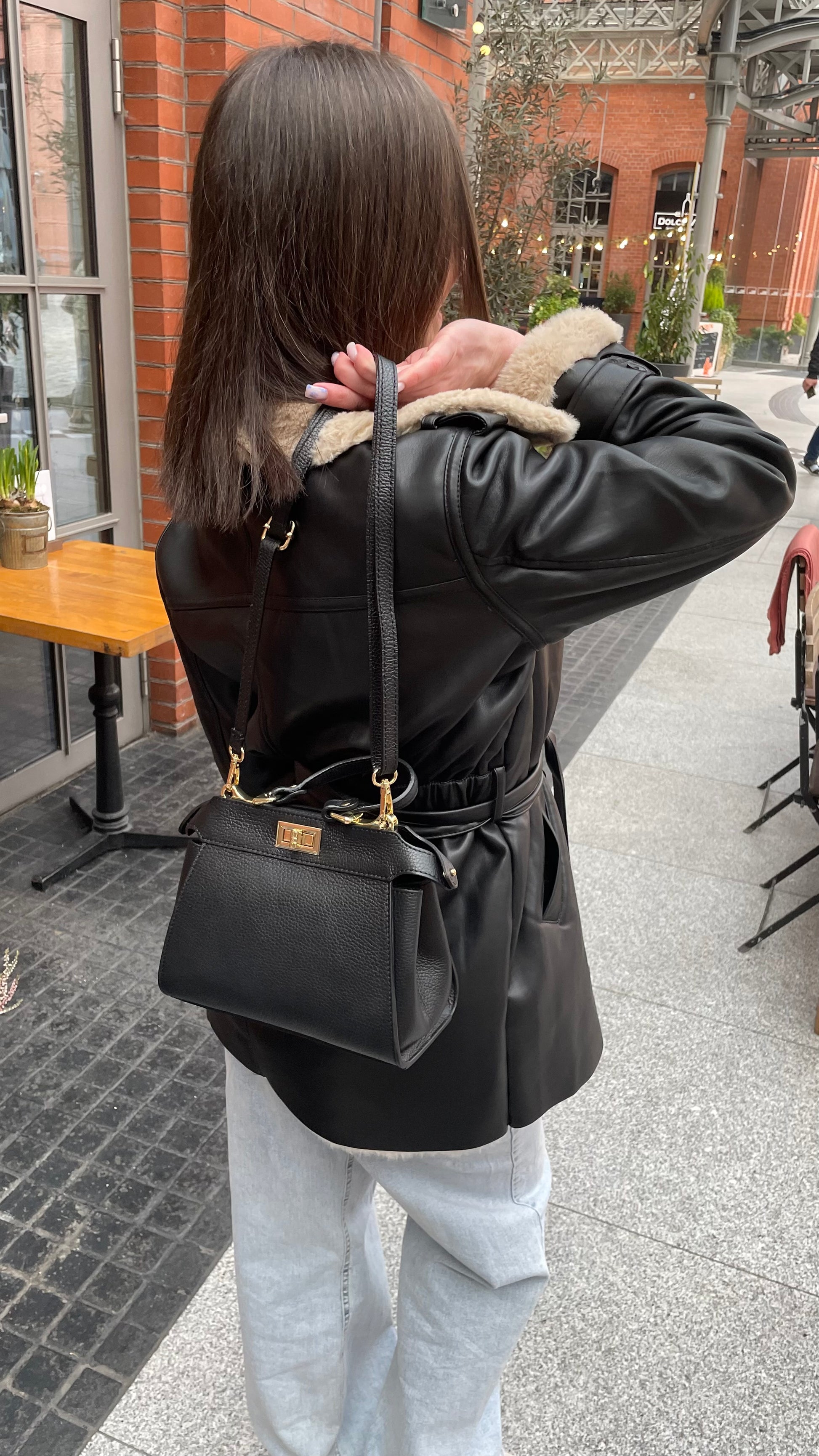 Ta włoska torba wykonana z najwyższej jakości naturalnej skóry zachwyca prostotą i elegancją. Klasyczny czarny kolor sprawia, że idealnie pasuje do każdej stylizacji – zarówno na co dzień, jak i na wieczorne wyjścia. Wyposażona w dwa wygodne paski, pozwala nosić ją w ręce lub na ramieniu, zapewniając komfort i swobodę ruchów.
