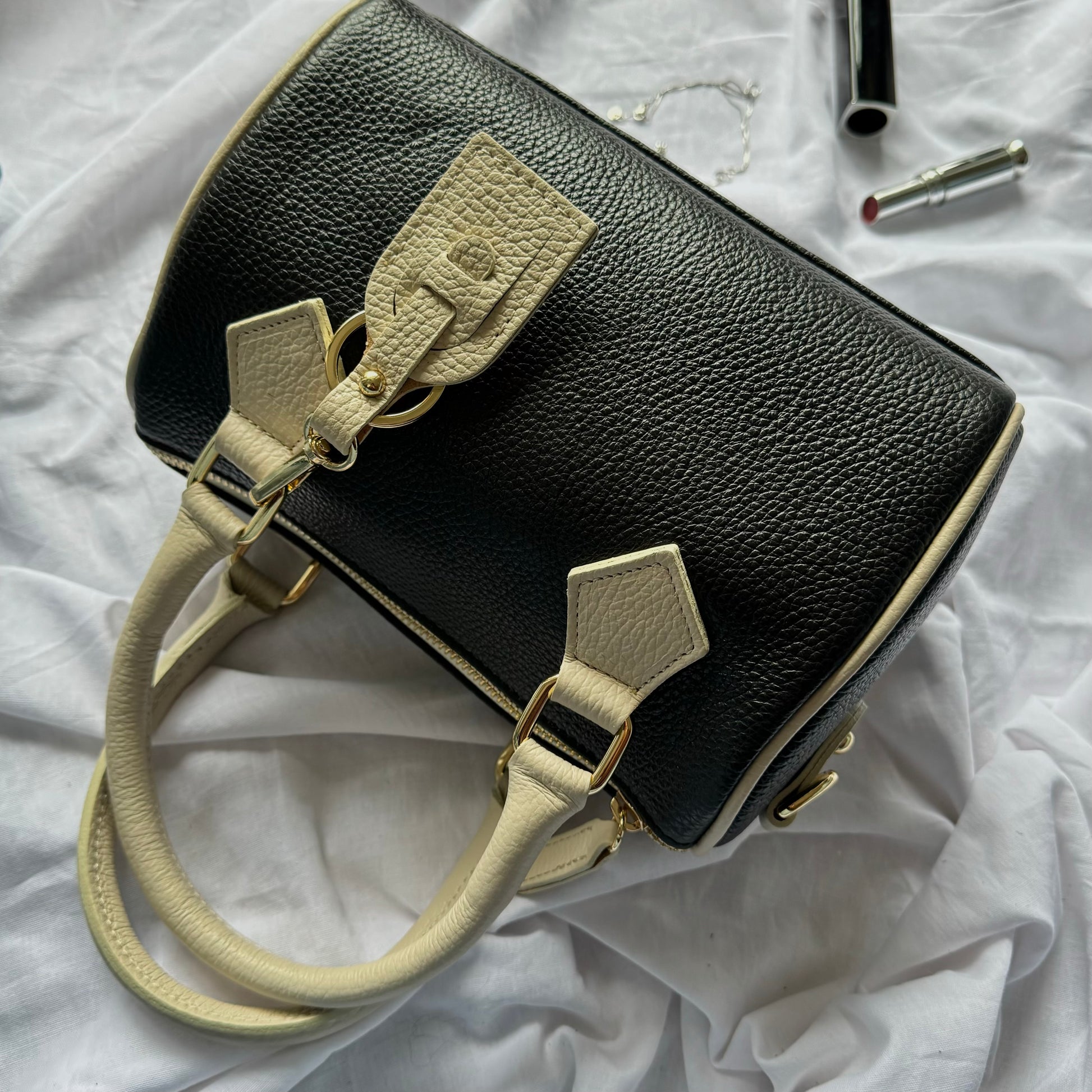 Połączenie czarnej fakturowanej skóry z jasnymi elementami i złotymi okuciami tworzy luksusowy, ale uniwersalny look.