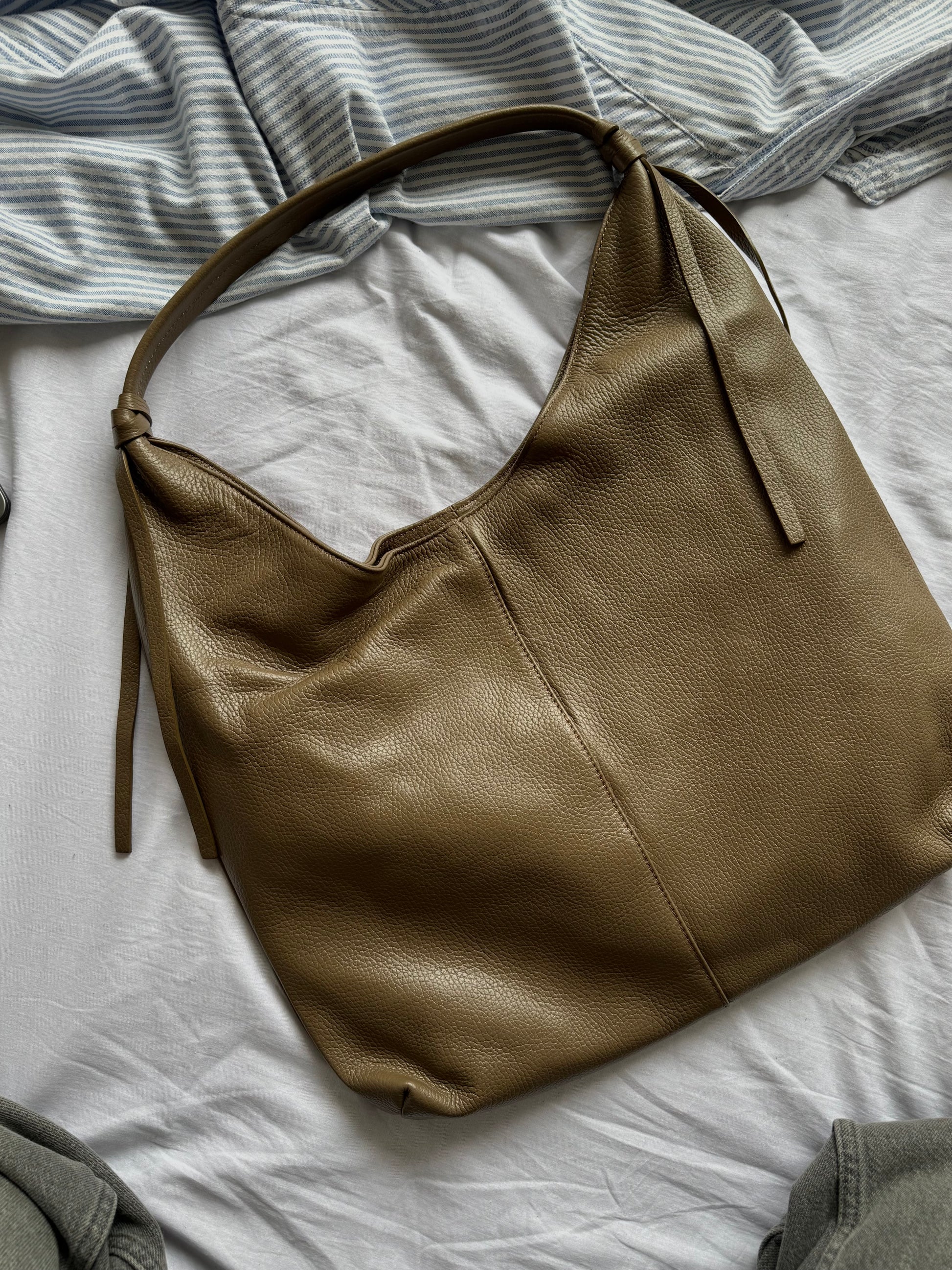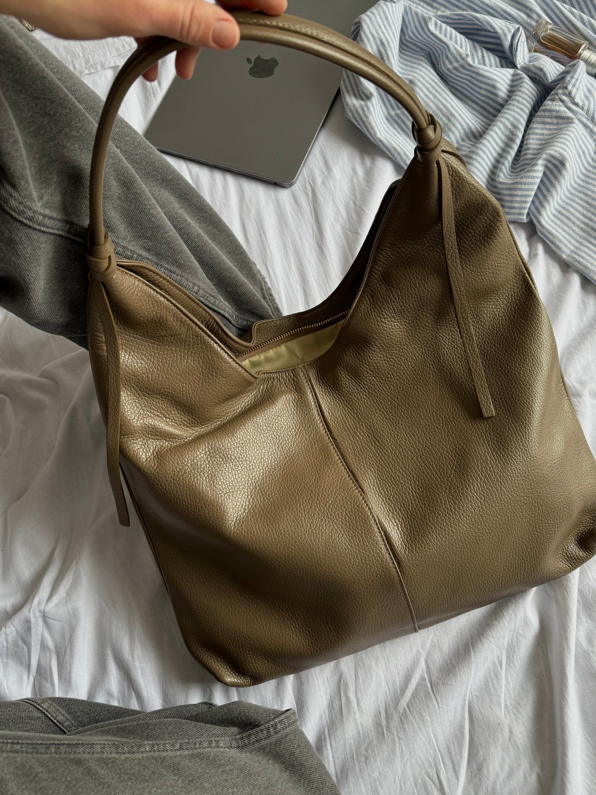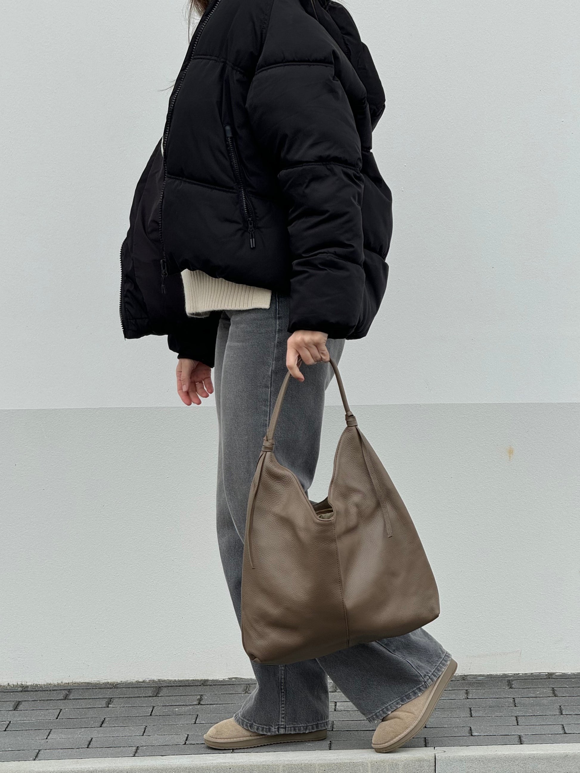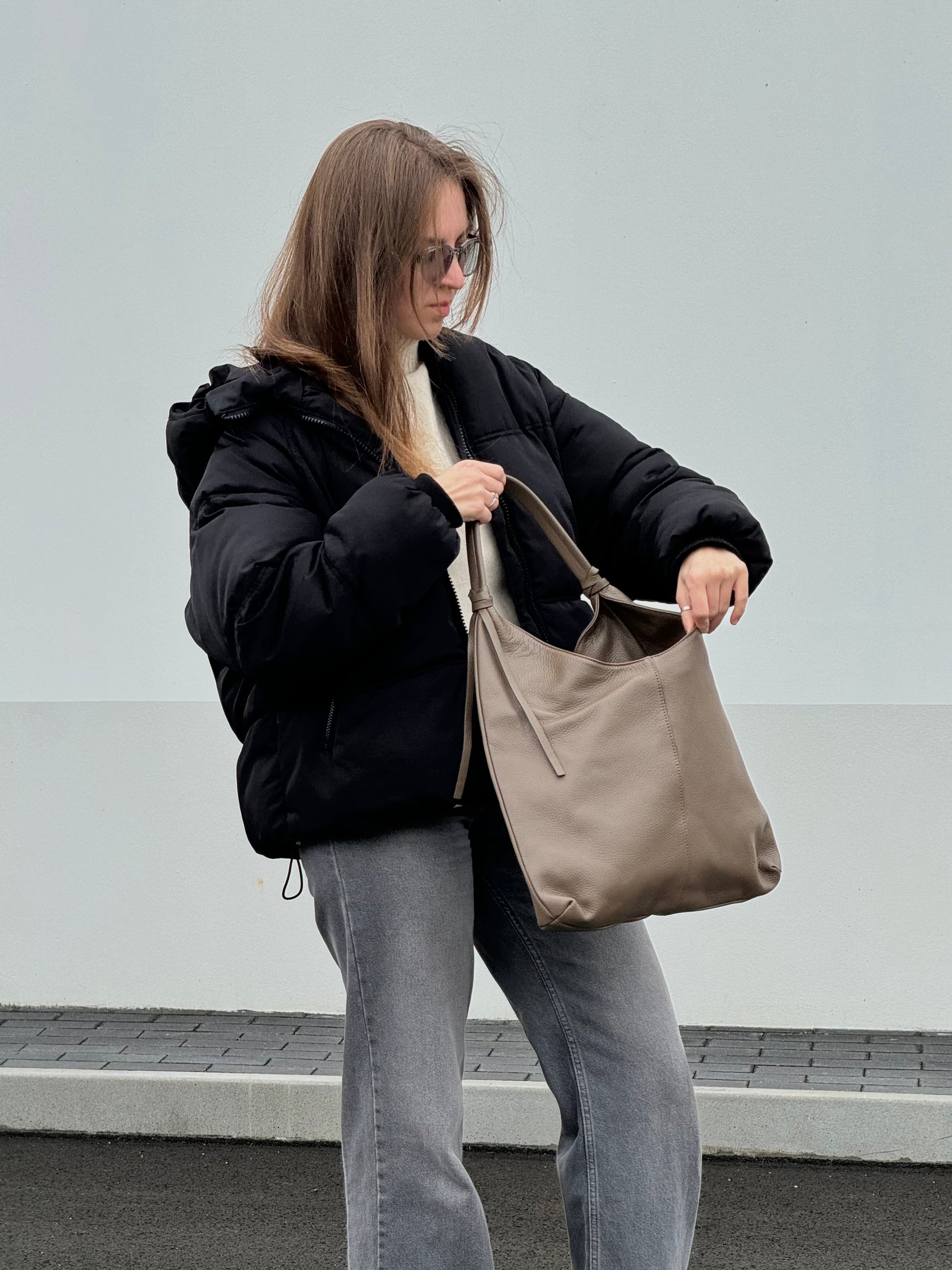 Przestronna i elegancka torebka wykonana z wysokiej jakości naturalnej skóry licowej o pięknej, lekko ziarnistej fakturze. Odcień taupe scuro nadaje jej klasy i sprawia, że pasuje do każdej stylizacji – zarówno codziennej, jak i bardziej eleganckiej.