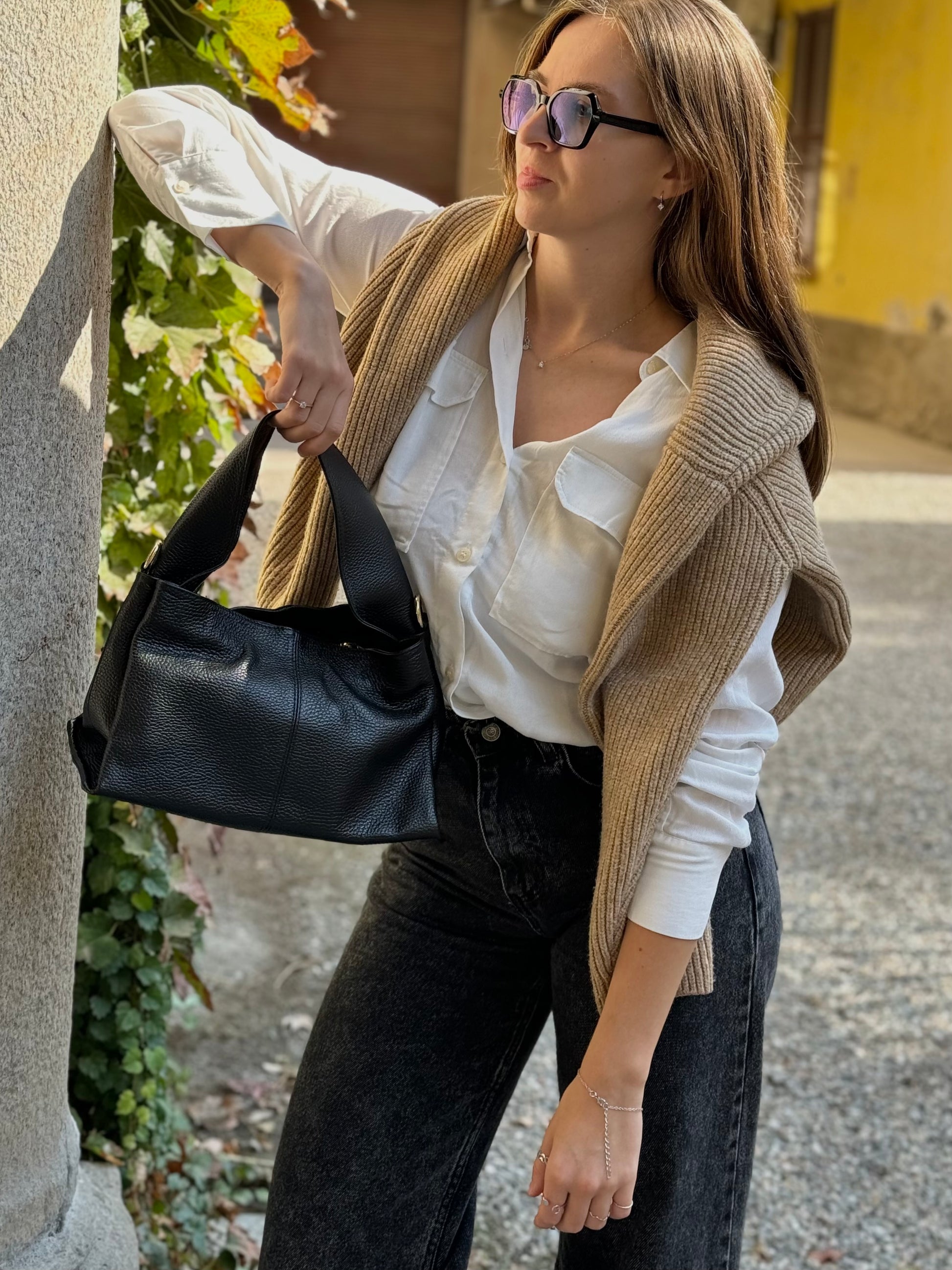 To stylowa torebka o kompaktowych wymiarach, która idealnie łączy elegancję z codzienną funkcjonalnością. Wykonana z wysokiej jakości naturalnej skóry (vera pelle), sprowadzanej z Włoch, zachwyca starannym wykończeniem i klasyczną formą.